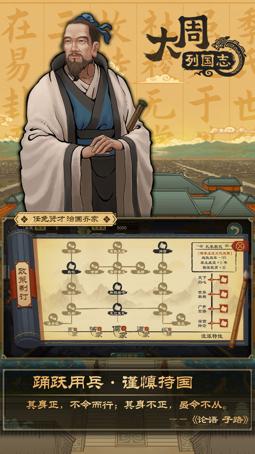 “社稷无常奉,君臣无常位,自古以然。高岸为谷,深谷为陵。三后之姓,于今为庶!” ——《左传 昭公三十二年》 这是一款以“涿鹿之战”到“王莽篡汉”的时间线为背景的历史策略-模拟经营游戏,再现了从华夏源初的上古战场,到礼乐文明的西周初年,再到礼崩乐坏的春秋乱世,以及战国纷争、秦出函谷统一六国,再到楚汉争霸、西汉末期数千年的宏伟历程。 天下大乱州牧并起之际,自可以毫无顾忌地逐鹿中原。但若生在一个天下初平、列国归心的礼乐之世,作为一方诸侯,又该用什么手段来发展壮大,实现自己“吞二周而亡诸侯”的野心呢? 挑战天子威权,压服列国,谋图霸者之业; 或是东出函谷,扫灭列国,坐拥六合之土。 霸王之路还是皇者之路,全在“君上”一念之间! 【剧本与AI】 ◆从涿鹿之战至绿林起义,跨越数千年时间,最多时有数十个诸侯国并立,超过千座城池,细致描画了那段历史风貌。 ◆AI的行为模式多元化,参照历史最大程度还原了百家争鸣与诸国征伐的沧海浮沉。 【王朝模式】 ◆王朝系统诠释了从礼乐之世到诸候征伐再到大一统的集权帝国的历史变迁。 ◆在不同纪元下,诸侯遵循的规则也不同,玩家真正代入到这时代中,并推动纪元变迁。 【百家争鸣】 以“百家争鸣”为核心,游戏内设计了儒、法、兵等九大文化流派。 ◆文化:诸候与地方城池都有着流派文化属性,其奉行的文化影响着上至国家发展方向、下至粮产兵员。甚至可以通过强大的文化影响力,吸引他国城池主动归降。 ◆国政:不同流派合计超过一百组的国政改革措施,践行政治理念和发展之路,引领百年革新潮流! ◆人才:不同流派的人才各有所长,不论是担任城守、朝臣;还是执行任务,均需要知才善任,才可以发挥其最大的效用。 【内政管理】 ◆典章国制:进行郡县制、郡国制等机制改革,以及三公九卿、内朝制等官制改革,定制国家的运行体系。 ◆阶段进阶:历经先民、方国、礼法、圣人、国族等阶段演进,解锁专属文化、政策树与战略,铺就文明发展脉络。 ◆宏观管理:调节税率、役率、水利、人口、城防、文化、农业建设、军事建设等,规划设定发展目标。 ◆城市特性:城市有不同地型和特性。有些城市关塞易守难攻,有些城市交通便利发展快速,有些城市水系发达利于发展农业… ◆地方治理:需要综合考虑和安排各城的经济发展、文化、治安、军备。 【外交谍报】 ◆外交:丰富的外交关系:宗主、附庸、盟友、仇敌等在推演中不断变换。涵盖联姻、宣战、结盟、威压等多达数十种外交选项,还原历史上的经典博弈。 ◆谍报:安插细作,建立情报网,天下事尽显眼底。刺杀、策反、煽动、妨碍...在游戏中体验“荆轲刺秦”。 【军事系统】 ◆战略:战略上,配合外交操作,合纵连横、远交近攻、围魏救赵等行为都能在游戏中实现。 ◆战备:征招预备役、扩充兵员、训练军队、设置兵种、列装军械。 ◆战斗:百变战场,多兵种大方阵配合作战,让玩家可以从大局着眼指挥作战。 ◆军将:时代背景下的将领体系,结合白起、韩信等历史上赫赫有名的将领人物,实现酣畅淋漓的征战。 【文物系统】 文物,是历史的见证者。文物,用沉默却又深沉的姿态站在历史长河中,记录下无数文明的点滴细节。 ◆高度还原历史长河中那些珍贵的文化瑰宝,在游戏中可以自由地打造、收藏以及养成,供奉文物可以获得对应的增益效果。 ◆通过局内随机事件可以发掘、获取文物,游戏过程增加更多未知性。 ◆占领城池、覆灭其他势力有机会获取对方的文物,乱世之下,怀璧有罪。 【奇观系统】 奇观,犹如中华大地上璀璨耀眼的明珠,长城、始皇陵、兵马俑...它们将宏伟与精致融为一体,如同一幅幅巍峨生动的艺术品,展现着古代文明的智慧与勇气。 ◆对历史奇观的深入探索考究,还原其历史背景与文化元素,古人的智慧结晶跃然于列国版图之上,彰显华夏历史文化的厚重气质。 ◆每座奇观都将带来独特的机制改变或属性提升,选择合适的城邑发起建造,为征战乱世提供更多可能性。 ◆覆灭势力,占领奇观,每一座建筑都将成为新的战略目标。 【传统古制】 在历史上,君王们经常自称“天子”,意为君权天授,为天之子,以此昭示正统性和权威性。对“天”、神明、宗祖的敬畏,是历史传统中不可缺少的内容。 ◆天命五德:五德之说由阴阳家邹衍提出,金、木、水、火、土五行看成五德,认为历代王朝各代表一德,按照五行相克或相生的顺序,交互更替。游戏内设计天命与五德系统,影响着王朝兴衰。 ◆祭祀系统:“国之大事,在祀与戎”。祭祀神邸,祈求粮食丰收、灾害消治,以保国泰民安。祭祀先祖列宗,彰显君主正统,以安朝堂太平。 【其他系统】 ◆随机事件:游戏中包含大量的随机事件,在游戏过程中体验时代的变化莫测。 ◆学宫辩论:还原百家争鸣的思想激辩,游戏中会不定期在不同流派间展开辩论。 ◆戎狄系统:玩家可以与戎狄以及西域、匈奴进行交好、征伐、可请援。为王朝体系下的局势环境增加了更多元素,也体现了民族、文化的融合。 ◆派系系统:派系权谋在朝堂交锋中浮现,再现古代朝堂之上的权力集团博弈,将内政、军事、权力斗争深度融合。 ◆祖灵系统:可以通过攻占城邑、完成政策等行为来获得“授命”,使用“授命”点数发动卡牌,为己方势力带来即时性效果,例如直接完成组建军队、