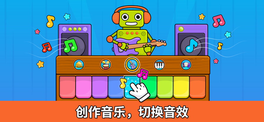 宝宝钢琴是一款适合1~6岁儿童的音乐游戏。我们的游戏标榜给孩子们五种兼具娱乐和教育的游戏活动。这款学习型游戏能够帮助孩子们培养创造力、音感、手眼协调、肌肉灵活度以及专注力。宝宝钢琴是学前儿童,包括幼儿园中小班孩子们最好的选择,同时也适合有自闭症等发展障碍的儿童。 宝宝钢琴有五种不同的游戏活动可以选择: 儿歌:我们一共提供了八首耳熟能详的曲目 - 铃儿响叮当 - 生日快乐 - 小星星 - 王老先生有块地 - 碰!鼹鼠跑了! (Pop Goes the Weasel) - 卖松饼的人( The Muffin Man) - 公车轮子转一转( Wheels on the Bus) - 五只小猴子 给孩子们的乐器:孩子们透过演奏不同的乐器—钢琴、鼓、铃铛、长笛、吉他、小号、铃鼓以及合声。精美的动画搭配超酷的角色,能够提供2~5岁的孩子们最棒的体验! 各种音效:这些音效不仅仅具有娱乐性,还富有教育意义。透过这些游戏活动,孩子们能够辨别不同动物、交通工具等等的声音。宝宝钢琴收录了6个领域里超过60种适合孩子们的音效。 - 动物 - 交通工具 - 孩子 - 机器人 - 异形 - 环境音 摇篮曲:八首脍炙人口的摇篮曲能够帮助您的孩子顺利进入甜美梦乡。让你的小孩选择一个心仪的角色,并且在宁静的曲调中入睡。 游戏:共有八款益智性音乐游戏,让孩子们在不同地点帮助Bimi Boo并和他一起冒险。这款游戏能够培养您的孩子对音乐的热情,适合所有1~5岁的小男孩和女孩。 宝宝钢琴不需要Wi-Fi就能玩,不管是小男生还是小女生都会喜欢我们的游戏的! 在这里,和Bimi Boo一起,我们尽力提供您的孩子最佳的游戏体验。你不会在我们的游戏中看到令人厌烦的广告,同时我们也希望能够收到您的任何回馈和建议。