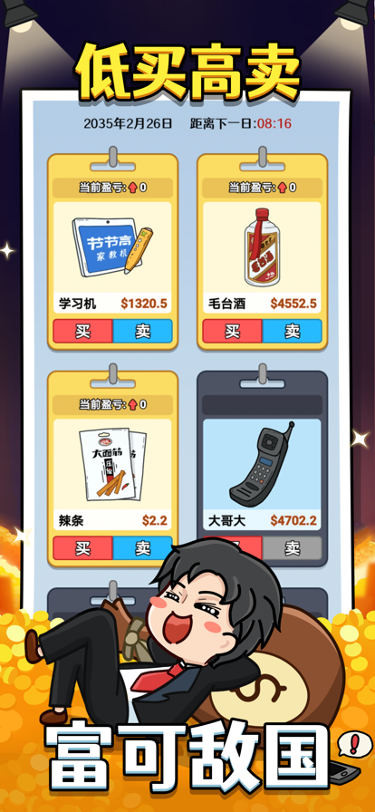 【简介】 20岁进入社会闯荡,在退休之前能否实现赚到1个亿的小目标? 倒卖黄金、域名、白酒、手机...... 创办氪金游戏公司、房地产公司、电器制造厂、网红主播...... 花钱购置豪宅豪车、打打高尔夫、来场环球旅行...... 商海沉浮的一生,也是时代的缩影。 每个致富浪潮到来时,有人一飞冲天,有人苦心经营,也有人落得满盘皆输。 出身随机,但机会相同。选择,由自己把握。 【操作】 市场:点击物品可购买/出售 创业:创办公司时需要大笔投资,后期可追加或减少投入,公司会涨跌,可获取盈利 花钱:点击消费品可购买,不同消费品对名声和健康值的影响不同