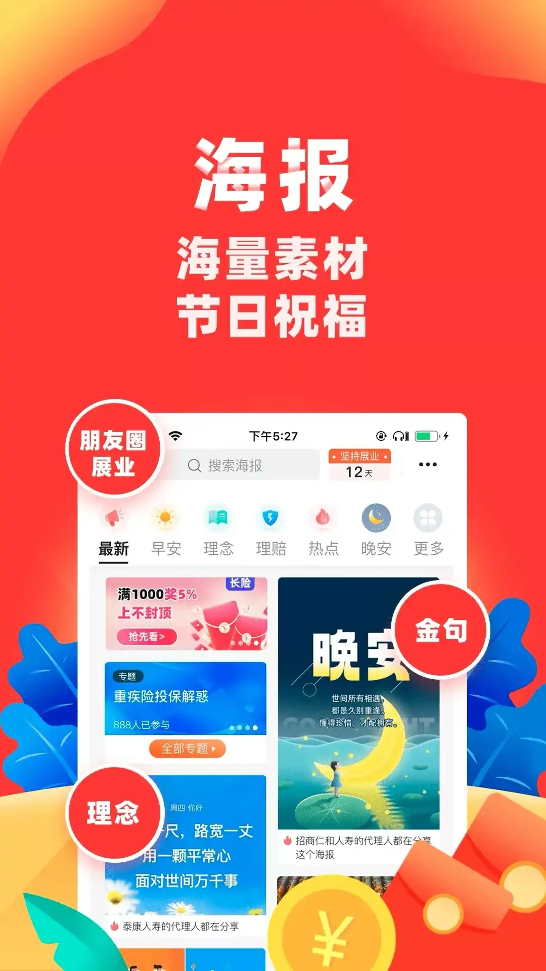 300万保险代理人都在用的神器 1.【产品】专属保险产品,种类多又全,高性价比。推广费达80%。 2.【计划书】保障条款清晰,保费测算零误差,利益演示更准确。 3.【海报】海量素材,节日祝福。一次分享引爆朋友圈,客户时刻关注你。 4.【技巧】详解各类爆品,图文并茂、案例清晰。大咖手把手教你怎么卖保险。 上不封顶的高额推广奖励 5.【新手专享】新人即可获得30元现金奖励。 6.【会员体系】提升会员等级,获取高额签单奖励金,可超过400元/单哦! 7.【邀请有奖】一次邀请,永久获利。每次好友出单(须签约),您均可获得推广费提成10%。