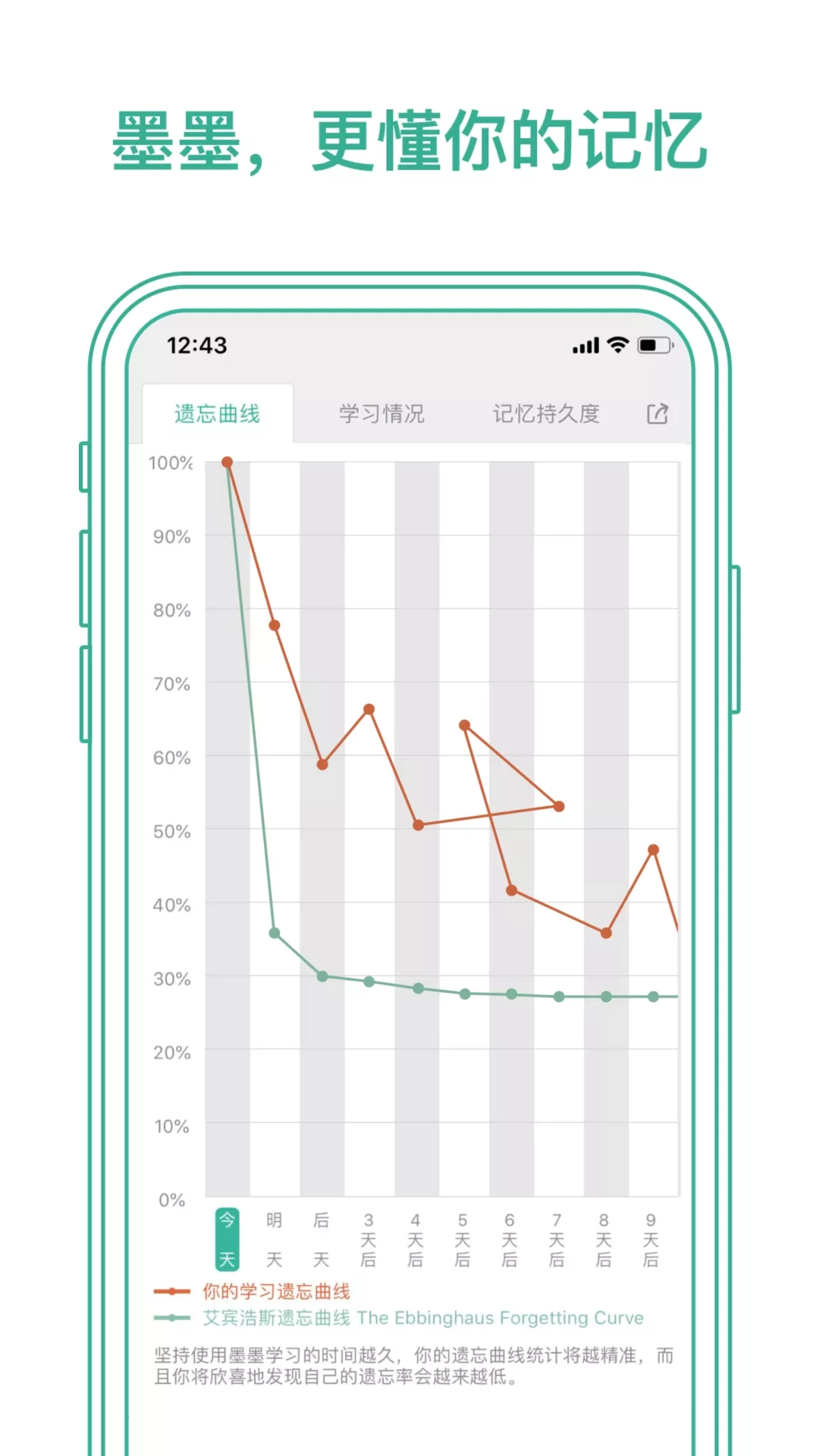 墨墨背单词,高效抗遗忘,完美规划海量词汇记忆。 • 全应用商店累计超过 3 亿下载总量 • 深受考研用户欢迎的背单词App • 教育类好评率超高的产品之一 • 获得应用市场奖项如:「极光奖」、「匠心奖」、「至美奖」、 「金米奖」、「设计奖」,并多次获得各应用市场官方专题推荐。 • 墨墨发布了具有可解释性的记忆模型,并发布于全球数据科学领域权威会议 ACM SIGKDD 《A Stochastic Shortest Path Alogorithm for Optimizing Spaced Repetition Scheduling》 • 墨墨首次将记忆预测与调度优化相结合,提供完整的间隔重复规划系统框架,并发布于国际数据挖掘知名期刊 IEEE TKDE 《Optimizing Spaced Repetition Schedule by Capturing the Dynamics of Memory》 「这里有:科学高效的抗遗忘算法、精彩美妙的单词内容、简洁的操作,实实在在帮你高效规划海量词汇记忆。」 【精准高效的抗遗忘策略】 墨墨背单词基于 1200 多亿条用户记忆行为数据,结合你的每次记忆反馈,识别你的记忆持久度,分析你的遗忘曲线,精准定位你对每个单词的遗忘临界点,动态调整复习规划,帮你高效规划海量词汇记忆。 【完美配合知名词汇书籍】 墨墨背单词尊重权威的实体词汇书籍,全面兼容实体书籍的同步学习,词库实时更新,不管是小初高、四六八,还是考研、出国考试,墨墨背单词通通兼容,你再也不用担心所学词汇范围的权威性。 【简洁且极佳的单词内容】 墨墨背单词,为每一个单词都精心准备了简明的释义、丰富的例句和精妙绝伦的助记,单词内容的精细度远超同类产品。 【一目了然学习情况统计】 墨墨背单词以图表的方式记录了你复习的情况,并配合奖励策略督促你更好地坚持复习,包括三大图表统计系统: - 遗忘曲线:真实反映了你在每个阶段对已学单词的遗忘率; - 学习情况:你每天复习了多少单词,已学情况及未来的复习压力; - 记忆持久度:你可以清楚地看到已学单词的熟知度情况。 【创建属于自己的云词本】 墨墨背单词允许你随时添加新单词到学习列表,你可以创建属于自己的云词本,或提取一篇文章中所有的单词,很好地配合了你平时生活学习对规划单词记忆的需求。