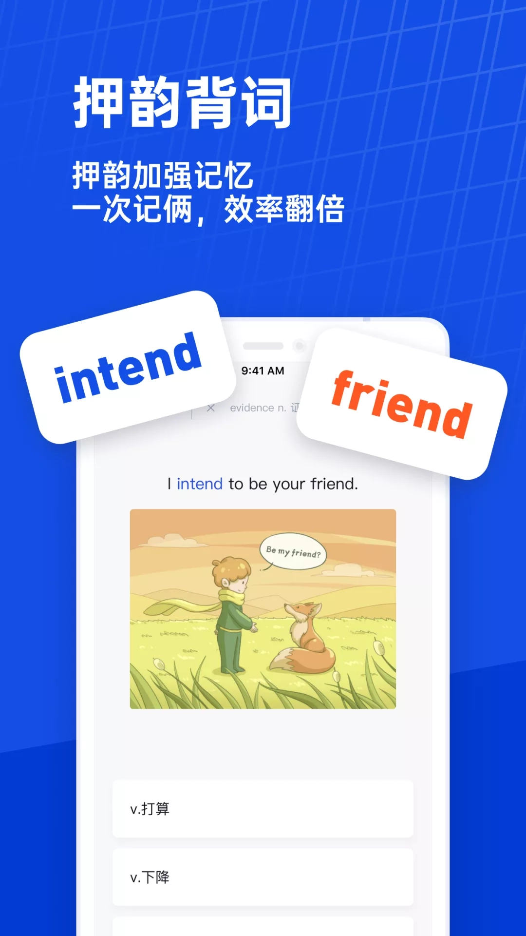 【产品简介】 基于艾宾浩斯遗忘曲线,科学进行记忆规划,让你背单词更轻松 每天仅需十分钟,一年可掌握超多词汇 你可以根据系统推荐的单词进行学习,也可以自主选择学习范围 灵活的学习模式,让你使用起来更高效 【产品功能】 卡片模式:认识?不认识?让你真正掌握每一个单词 自主选词:每天背哪些单词,你说了算 单词助记:谐音、词根词缀,多维度和单词建立关联,帮助记忆 巩固训练:选择释义、拼写单词,多种题型让你全方位掌握单词 单词词典:随时随地查单词,方便又好用 生词本:学习中遇到的生词,一键加入生词本 记忆曲线:为你量身定做自己的记忆曲线 自定义词库:创建你的专属词库,只背你想背的单词 自建笔记:释义、例句、助记、拓展,全部都可以自定义 超全词库:覆盖覆盖四六级、考研、留学、小学、初中、高中等各版本教材