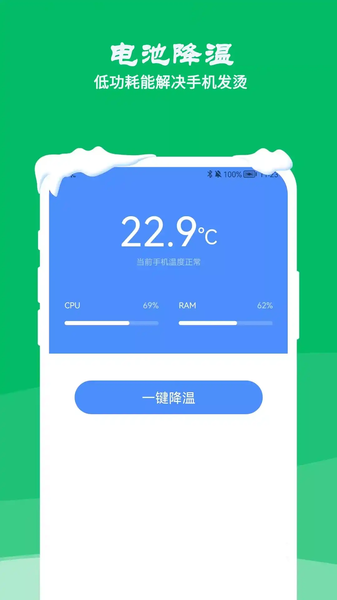 降温测温精灵,一键真降温,超强省电 功能: 【降温】一键降温,不再为手机发贴烦恼 【高温预警】高温预警,枕边充电也安心 【电池省电】一键省电,智能监测手机温度,电量,电压,健康状态