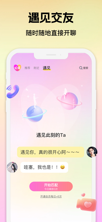 心见,随机匹配全国各地视频聊天社交平台! 心见,专注于随机视频匹配交友软件,通过基于随机和全国各地完成实名真人认证的陌生人视频聊天,让爱聊天的你时刻都有人陪伴伴在你身边,无论是想同城交友、同城约会、找搭子、找树洞、附近交友等,告别试探探索,从陌生人成为牵手的伴侣,在心见,让每一次视频聊天交友都充满可能! 【先三观后五官 蒙面视频】 每天限时开启,真人认证不只是看脸!也可以先三观后五官,不止看脸更看精神共鸣,独特蒙面酒馆「视频蒙面5分钟」,视频聊天前5分钟,双方聊得来,互相知聊后,公开身份后才可以看到对方!找搭子?同城交友?附近交友?树洞?情绪倾诉?寻觅伊人?都可以! 【全国各地 视频聊天】 基于先进的匹配技术,心见能够智能匹配全国各地的男女,大大提高了视频聊天的效率,找搭子、同城约会、附近交友不在拘束于文字聊天,视频聊天也可以,无需苦等回复,发起匹配,和他趣味浓的人一起玩,告别尴尬,让爱聊天的你,时刻有人陪,还能解锁交友、搭子、树洞、倾诉等多元社交玩法; 【真人视频 安全交友】 心见,坚持真人交友,所有互动的用户均需通过真人认证,从源头上保障用户真实性。我们严格保护您的聊天内容隐私信息,让您在探索同城交友、进行附近约会、找搭子、想倾诉时无后顾之忧,因此在心见上,与您互动的对方,无论是文字聊天或视频聊天交友都100%为真人,减少“照骗”“杀猪盘”,让同城交友、找搭子、附近交友等不再遥远,一次文字聊天,视频通话就可开启。 【从陌生到陪伴故事】 “刚失恋,心情不好,身边也没有人能倾诉,连续好多天晚上8点在心见的蒙面酒馆上视频,遇见了很好的他,现在我们已经成为彼此最重要的对方”—— 28岁,女性用户 “最初只是想找个能聊天的搭子,通过心见的蒙面视频聊天认识了几位附近的人,现在我们已经成了固定的饭搭子和电影搭子,蒙面视频交友让生活充实了很多。”—— 26岁,男性用户 心见将全国各地随机匹配视频聊天、严格安全审核与即使沟通匹配深度融合,已成为众多年轻人视频聊天寻找搭子、同城交友,附近交友、情感倾诉的交友选择平台,