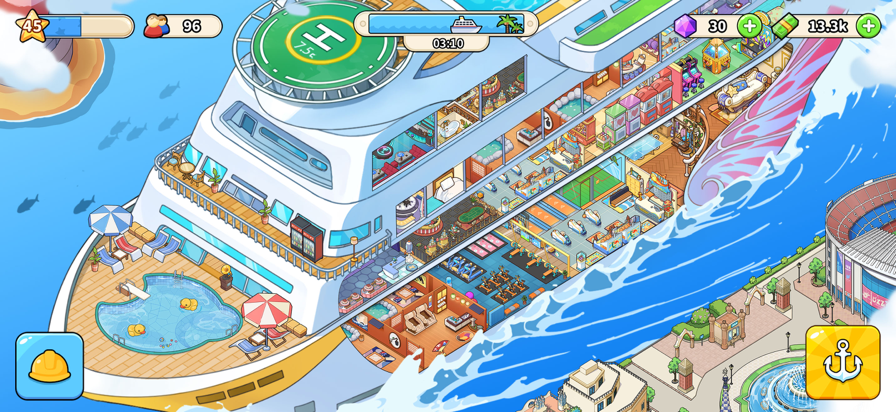 这是一艘将环游世界的游轮! 从几间普通的小屋到豪华小屋,应有尽有,从无聊的客运到设备齐全的梦想豪华游轮,从空旷到拥挤,再到难以买到的门票,从头开始。这是您打造的梦幻豪华游轮! 在这里,您将遇到来自世界各地、不同地方、不同职业、不同爱好和需求的客人。升级和完善您的游轮,为他们提供最好的服务,开启他们的梦想假期,提升您的声誉。这是一个繁忙的城市! 在这里,您可以建造和升级的不仅仅是机舱,娱乐项目、餐饮和乐趣自然是必不可少的!电影院、餐馆、果汁吧,最重要的是厕所!各种各样的设施,一切由您选择!让你的超大型游轮让客人大开眼界!这是一个海上的梦幻购物中心! 在这里,你可以去不同的地方,有些地方相似,有些地方非常不同。您的客人有机会下船,您的游轮有机会吸引新客人,全世界的对话都在您的游轮上进行! 游轮就要启航了,快来加入吧!