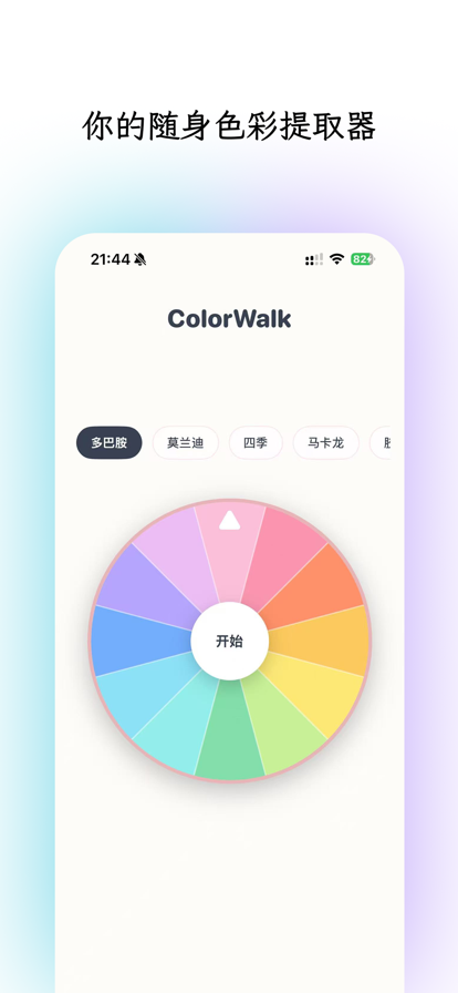 风靡全网的 Colorwalk(色彩漫步)极简打卡工具来了! 每天两点一线的生活是否让你感到一丝麻木?也许你需要的不是一场远行,而是一个重新观察身边的理由。「Colorwalk-色彩漫步」不仅仅是一个抽色工具,更是一场带你逃离数字焦虑、寻找现实微小确幸的“正念游戏”。 转动随机色彩转盘,带上手机出门寻宝。一朵黄色的花、一个蓝色的路牌、一杯绿色的抹茶拿铁……将这些散落的同色系日常碎片收集起来,分享属于你的色彩生活。 核心功能 【色彩盲盒转盘】 不知道今天拍什么?点击转盘,随机抽取你的“今日幸运色”。将漫无目的的散步,变成一场充满未知的现实寻宝游戏,治愈你的选择困难症。 【多种主题色卡】 提供多巴胺、莫兰迪、四季、马卡龙等多种主题色卡,跟随你的心情,快来抽取吧 【无干扰的纯粹体验】 没有冗长复杂的社交信息流,没有花里胡哨的冗余功能。打开即用,用完即走。把时间还给生活,把美感留给画面。 适合这样的你: • 想要记录生活,但觉得长篇大论太累的“极简主义者” • 喜欢Citywalk,热衷于捕捉街头光影的“城市漫游者” • 深谙社交平台审美,需要高质量配图的“内容创作者” • 渴望在快节奏生活中,寻找几分钟内心平静的打工人。 生活从来不缺少色彩,只是缺少一个帮你框住它的滤镜。 现在就下载「Colorwalk-色彩漫步」,抽出你的第一个颜色,出门走走吧!