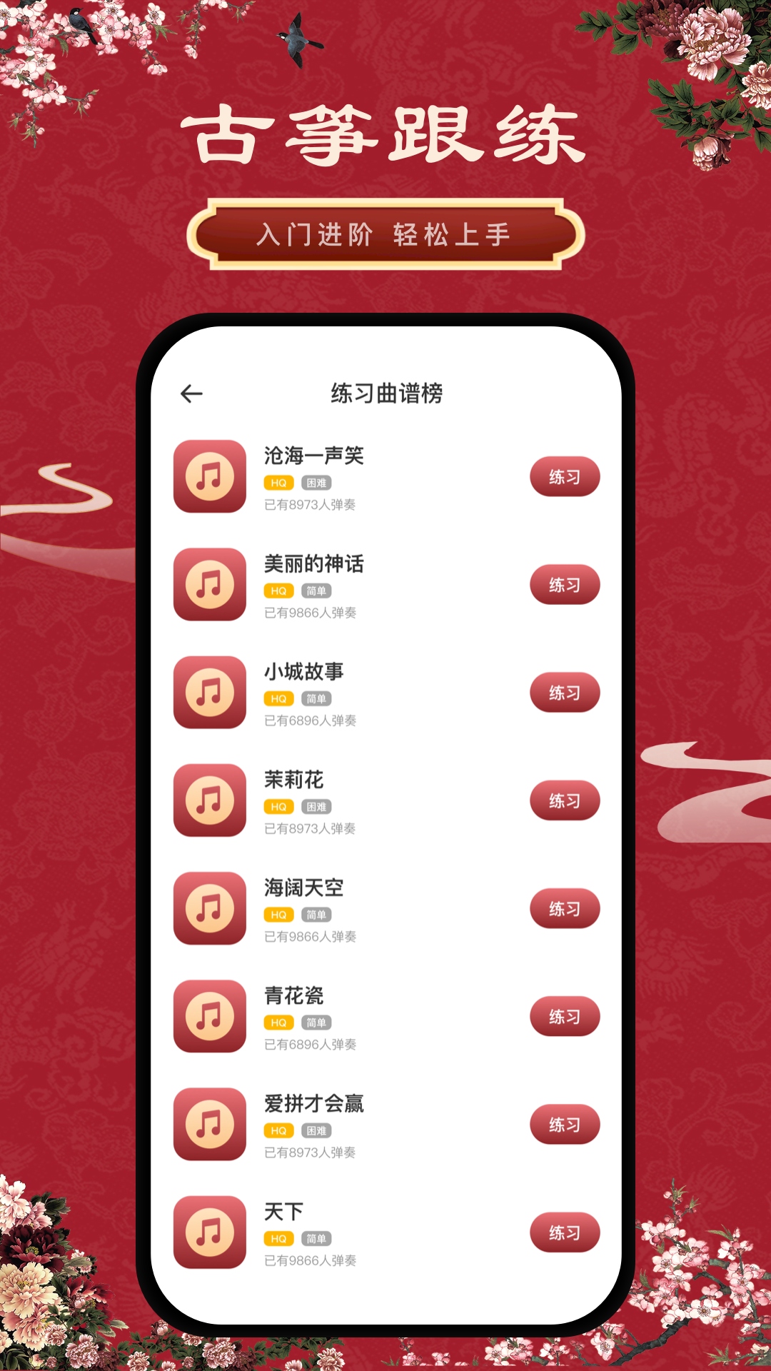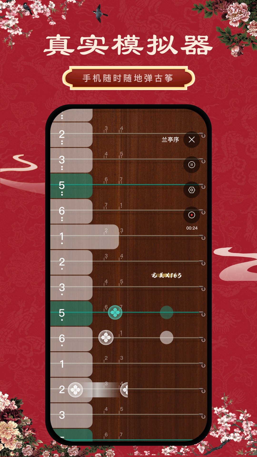 古筝模拟是一款专业模拟古筝弹奏的APP,仅用一台手机,就可以在线弹古筝,享受优美古筝乐!应用内包含古筝入门、进阶、考级精选教学视频、海量古筝曲谱、古筝选购维护、古筝指法,帮助您轻松学会古筝曲,哪怕零基础也能轻松入门! 【古筝弹奏】模拟古筝弹奏,零基础也能轻松弹奏优美的古筝曲,让你学琴不再枯燥~ 【古筝教学】阶段性古筝课程,让您零基础也能轻松学古筝! 【古筝游戏】拥有古筝跟弹模式,在娱乐的同时能够更有效率的学习~ 【在线练习】短时间学会《沧海一声笑》、《茉莉花》等入门歌曲。