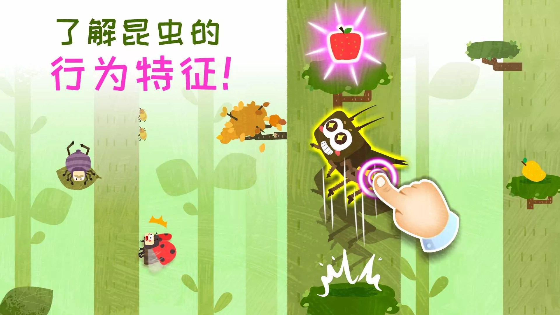 【奇妙昆虫日记】是一款专为宝宝设计的昆虫认知APP。 宝宝通过寻找+观察+思考,便能轻松学习昆虫知识! 瓢虫喜爱的食物是什么?屎壳郎有哪些外形特点呢? 宝宝们,一起开启奇妙的昆虫世界之旅吧! 产品内容: 昆虫“捉迷藏” ——锻炼宝宝观察力 小昆虫们都藏起来了,宝宝快发挥观察力,拨开蘑菇、翻动草丛、搬起石头,认真寻找!它们会喜欢藏在哪里呢? 益智昆虫图鉴 ——认知昆虫外形 成功找到昆虫,获得贴纸。宝宝根据昆虫外形,动手又动脑,完成拼图。拼图里面还有惊喜等宝宝发现哦! 森林医生来帮忙 ——了解昆虫习性 植物生病了,瓢虫、蚯蚓可是优秀的森林医生!宝宝引导瓢虫吃掉害虫,拖动蚯蚓消灭土里的细菌,帮助植物健康生长。 昆虫跳高、击敌赛 ——考验宝宝反应力 蟋蟀参加跳高赛,宝宝帮它躲避猫头鹰,跳上蘑菇,一飞冲天。警报!蚂蚁来偷螳螂卵了,宝宝快击退敌人吧! 产品特色: 1、结合昆虫特性进行互动,增进宝宝对自然的好奇心; 2、帮助宝宝认知昆虫的外形、食性、天敌、居住环境等; 3、精美萌趣的昆虫角色,培养宝宝的探索兴趣。 宝宝巴士(BabyBus)是专注打造儿童启蒙数字产品的原创品牌,累计服务全球5亿家庭用户。宝宝巴士秉承“快乐启蒙”的理念,用奇妙有趣的方式,为儿童量身定制以“好听(国学故事)、好看(儿歌动画)、好玩(互动APP)”为特征的海量数字启蒙内容,让孩子趣味认知、感受“真、善、美”。 宝宝巴士(BabyBus)已发布200多款APP,推荐使用宝宝巴士儿歌、宝宝巴士故事、宝宝巴士奇妙屋、宝宝巴士、宝宝恐龙家园、化妆小公主、宝宝航海挑战、奇妙美味日记、奇妙生日派对、奇妙鲜花房、奇妙恐龙帮帮队、奇妙手工调色、奇妙森林历险记、奇妙艺术日记、宝宝爱自然、照顾小宝宝、中华美食、奇妙好习惯、宝宝地震安全、奇妙星际厨房、宝宝学配对、奇妙农场、糖果工厂、雪糕工厂、宝宝小船长、奇妙咖啡餐厅、宝宝小画板、宝宝运动会、宝宝调色屋、宝宝甜品店、宝宝爱水果蔬菜、宝宝开车大冒险、恐龙王国、宝宝超市、宝宝医院、宝宝假日旅行、宝宝上厕所、宝宝梦想小镇、宝宝爱整理、公主化妆舞会、宝宝救援队、宝宝建城市、时尚小公主、奇妙宠物美妆店、奇妙运动日、宝宝魔力画笔、宝宝幼儿园、奇妙碰碰车、奇妙企鹅部落、奇妙梦幻城堡、奇妙昆虫日记、奇妙的动物家庭、奇妙珠宝店等APP。 欢迎联系 微博:@宝宝巴士 官网:http://www.babybus.com 邮箱:cn@babybus.com