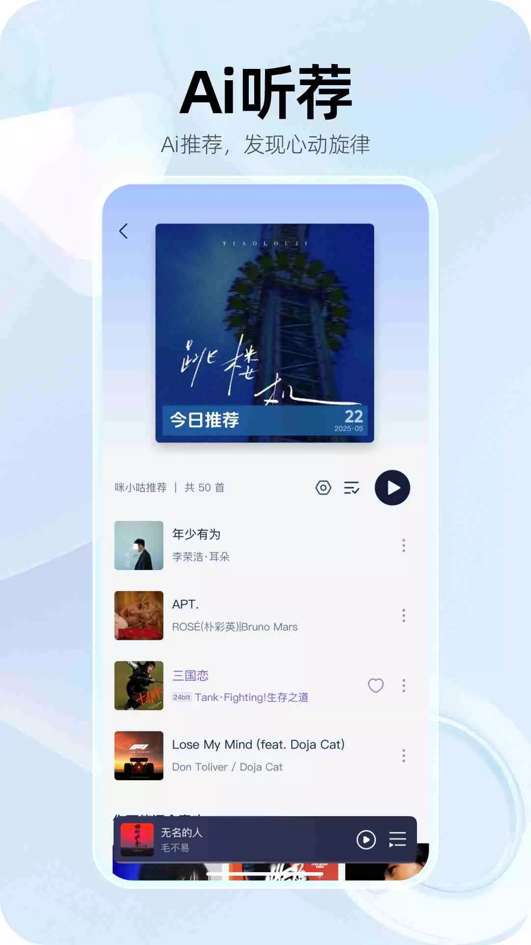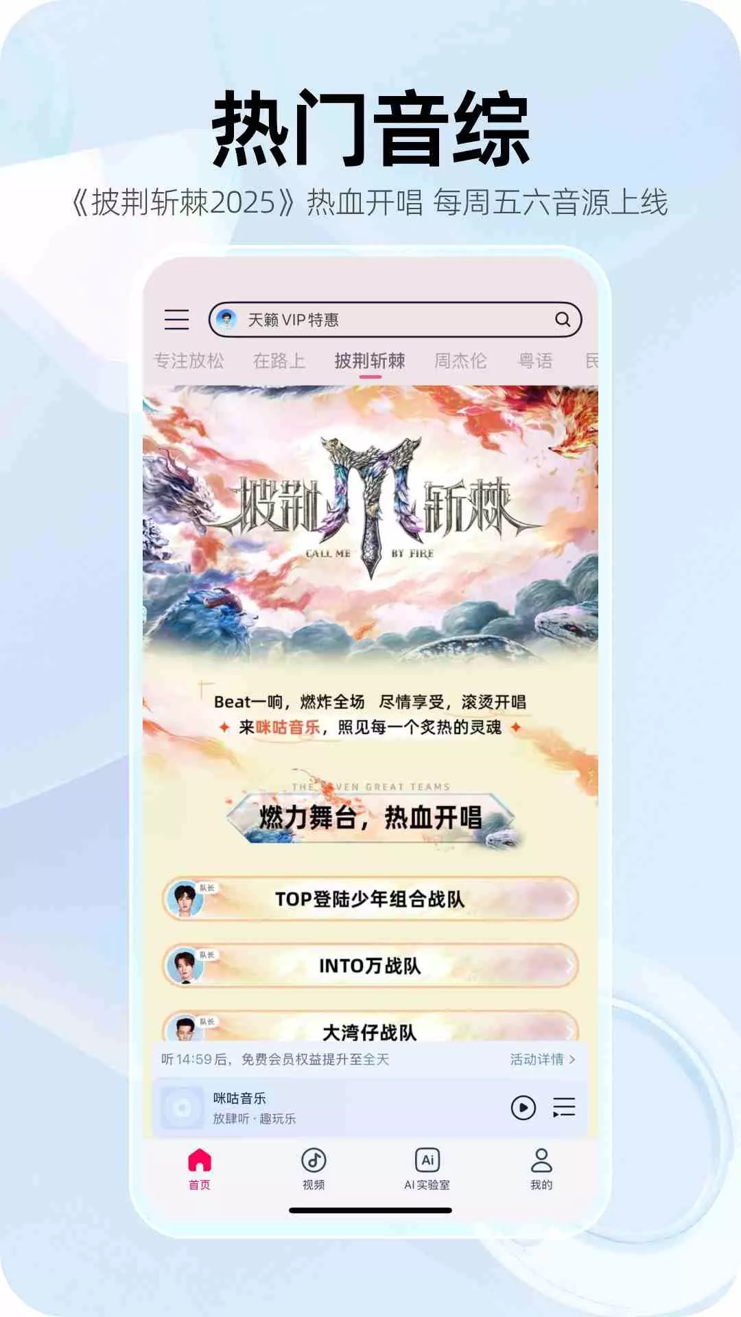 【无限畅听计划】每日听歌不花钱!千万曲库0门槛畅听! 听歌自由,就是这么简单!现在下载咪咕音乐,开启你的专属听觉之旅 。 咪咕音乐,耳朵的幸福指数飙升! 【精选推荐】《披荆斩棘2025》音源正式上线咪咕音乐,舞台重燃,传奇再续!Beat一响,燃炸全场,一起见证哥哥们用汗水重铸荣光,以信念劈开荆棘!每周五、六音源上新,邀您共赴滚烫盛宴>> 【个性播放器】多种播放器皮肤,风格随心换,打造你的专属音乐空间,听歌更带感! 【精选歌单】运动燃脂/学习专注/通勤解压,海量精选歌单,每个时刻都有专属BGM! 【极光音效】独享「HiFi房间」「纯净ACG」「动感电音」等音效,为您带来更出色的音乐体验,沉浸“响”受音乐~ 【视频彩铃】热门影视片段、爱豆全新MV,让通话等待“看”见精彩,还有比特数智人状态彩铃,来电时刻炫起来。 核心功能: •听 【千万曲库】4000万正版曲库,新歌发布,覆盖华语海外、内地港台等热门新歌,让你不再歌荒; 【极光音效】独享HI-FI房间,新增「纯净ACG」「动感电音」等6款等特色音效,还原至臻听感; 【热门推荐】在“我喜欢的”开启听荐模式,让AI推荐的歌曲更懂你心; 【一起听】全新功能,共享歌单,好歌可以一起享,无论相隔多远,都能和你「一起听」歌!