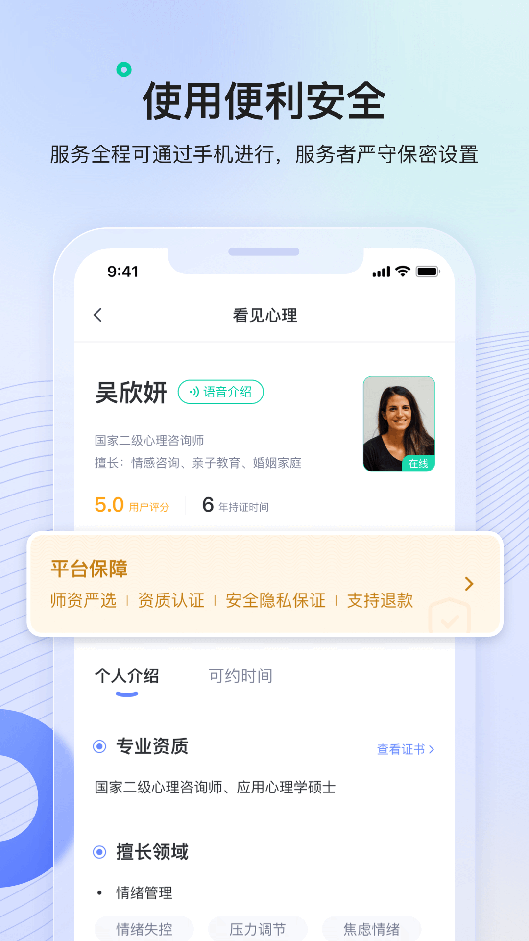 看见心理是一个多形式心理服务线上平台,致力于提供专业、靠谱和高性价比的心理咨询与倾听服务。我们提供情感、恋爱、婚姻、家庭、生活、亲子、教育、职场、个人成长等方面的心理服务。我们希望可以为你提供更便捷低价、安全可靠的专业心理服务。<br><br>「专业权威」<br>平台以自主培养及严格筛选相结合的方式,确保每一位心理服务者能够达到优秀的服务水平。平台会根据执业资格、培训经历、接受督导经历、个人素质和咨询伦理道德等方面进行评估筛选;经由平台培养的服务者也会经过系统理论及实践培训和筛选后,才可开始提供服务。我们已为用户做好专业把关,确保专业的服务水平!<br><br>「服务内容」<br>不论你遇到了情感烦恼、职场压力、学习焦虑,还是人际困扰;无论你希望倾诉生活困扰还是看见更真实的自己,得到成长和改变,你都可以在平台上找到适合的帮助。心理倾听或是心理咨询都会不带评判地给予你支持并提供相应的帮助。<br> <br>「隐私安全」<br>我们坚决保护来访者的隐私安全,平台会对文字、语音、视频安全加密,提供权威法律保障协议,保证双方权益!<br><br>「形式灵活」<br>你可以根据自身的需求选择心理倾诉或心理咨询服务,其中心理咨询服务可通过在线语音或在线视频的方式进行。你可以选择更适合你的服务方式。