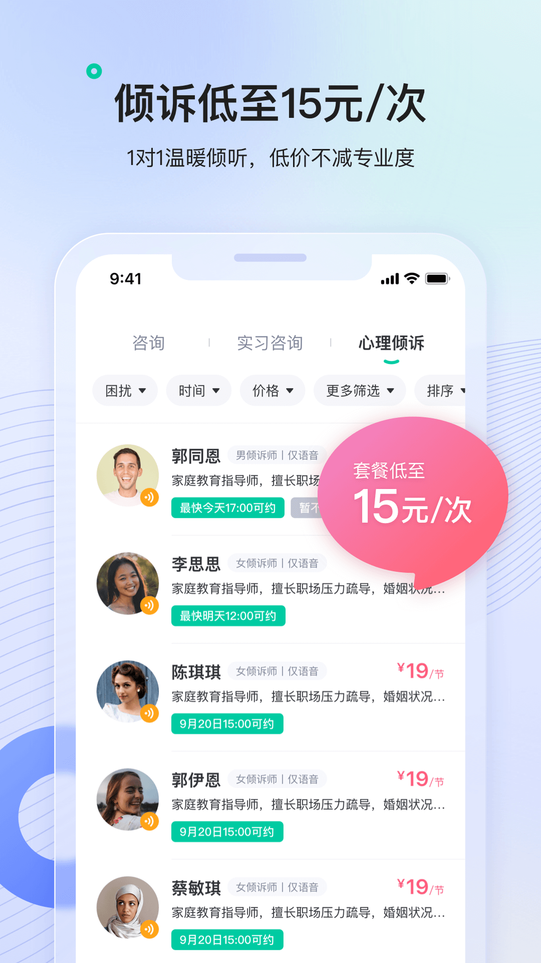 知名心理专家领衔,汇聚上万名持证资深情感、婚姻家庭、亲子育儿等全领域专家,为您提供专业、亲民、价格可负担的心理咨询服务,真正实现高品质与高性价比兼具。<br><br>服务覆盖全球174个国家和地区,支持50多种语言,线下门店遍布北京、上海、杭州、广州、苏州、合肥、南京等城市,打造全球化的一站式心理健康服务平台。<br><br>平台聚焦婚恋情感、情绪压力、亲子关系、职场发展、人际交往等多元心理问题,提供线上线下相结合的专业服务,让心理支持触手可及,致力于提升全民心理健康水平。<br><br>我们的服务:<br><br>【专业心理咨询】一键预约专家,恋爱婚姻、情绪压力、亲子育儿、职场发展等多领域问题,线上线下多种选择,价格亲民,轻松无负担,助您舒缓人生困扰;<br>【即时倾诉】无需等待,实时连线专家,享受超值心理支持,安心陪伴;<br>【心理测试】爱情、性格、情商等多类专业测试,价格实惠,帮您了解自己;<br>【心理课程】无论您是心理学爱好者,还是在婚姻、情感、亲子等方面遇到困扰,这里都有平价优质课程,为您指点迷津;<br>【互动心声社区】通过『心事信箱』『心球说说』『问答社区』等,记录心情,分享感悟,与他人互助交流,收获支持与力量。<br><br>核心特色:<br>【亲民实惠,安心选择】价格亲民,质量不打折,专业心理咨询服务触手可及;<br>【全球多元化服务】全球服务,随时随地在线咨询,快速响应;<br>【专业权威,团队强大】知名心理专家牵头,专业团队认证审核、培训上岗,全方位保障服务质量;<br>【丰富内容,轻松探索】心理咨询、即时倾诉、心理课程、心理测试、社区互动……让心理服务轻松融入生活;<br>【公益服务,回馈社会】平台专家积极参与公益,累计服务时长超过7亿分钟;<br>【隐私安全,权益保障】一对一专属咨询,文字、语音、视频加密传输,提供专业法律保护,保障咨询双方隐私权益。<br><br>立即下载,开启心理健康之旅<br>无论您身处何地,心理咨询APP为您提供随时随地的支持与陪伴。立即下载,探索适合您的心理服务吧!