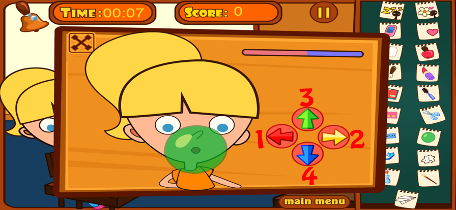 现在,您可以挑战自己,在老师来检查您之前在教室里捣蛋。 在这个游戏中,做一些现实生活中不允许的有趣技巧,例如:在课堂上吃饭,化妆,在手机上拨打电话等等! 避免被抓住和惩罚!