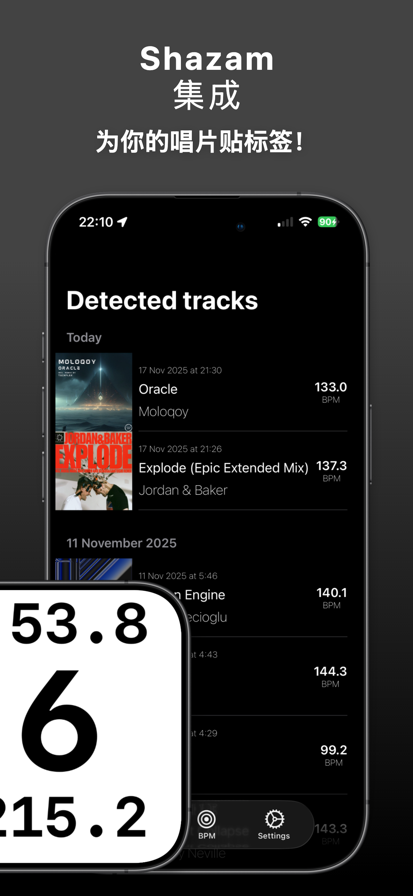 即时找到您周围任何音乐的BPM — 自动、实时。 您的多合一BPM计数器和节奏检测器。 使用设备的麦克风,该应用可以聆听任何歌曲、节拍或节奏,并以高精度持续计算节奏(BPM)。无需点击! 主要功能 • 自动BPM检测(无需点击) 该应用通过麦克风聆听并即时显示任何音乐、乐器或音频源的实时BPM。非常适合DJ、音乐家、舞者、健身教练以及任何需要快速可靠节奏分析的人。 • Shazam集成 在检测BPM的同时识别歌曲名称和艺术家。同时获取所有内容—曲目信息+节奏。 • BPM检测历史 查看所有过去的节奏检测,包括保存的时间戳、Shazam ID和BPM值。非常适合训练课程、DJ演出、排练和音乐发现。 • 全屏BPM显示 通过大型、清晰、高对比度的全屏模式提高可见度。从房间的另一端读取节奏—非常适合工作室、练习课程或现场表演设置。 • 变化追踪器(BPM图表) 使用动态图表可视化节奏随时间的稳定性。非常适合练习节拍的音乐家、致力于一致性的鼓手或任何想要节拍器级精度的人。 --- 您的可靠自动BPM计数器 无论您是分析曲目、练习乐器、准备播放列表、DJ演出,还是只是好奇歌曲的节奏,此应用都能提供准确、持续的实时BPM检测,而无需按任何按钮。 iPhone上最完整的自动BPM检测器—快速、简单、强大。 --- 使用条款: https://www.apple.com/legal/internet-services/itunes/dev/stdeula/