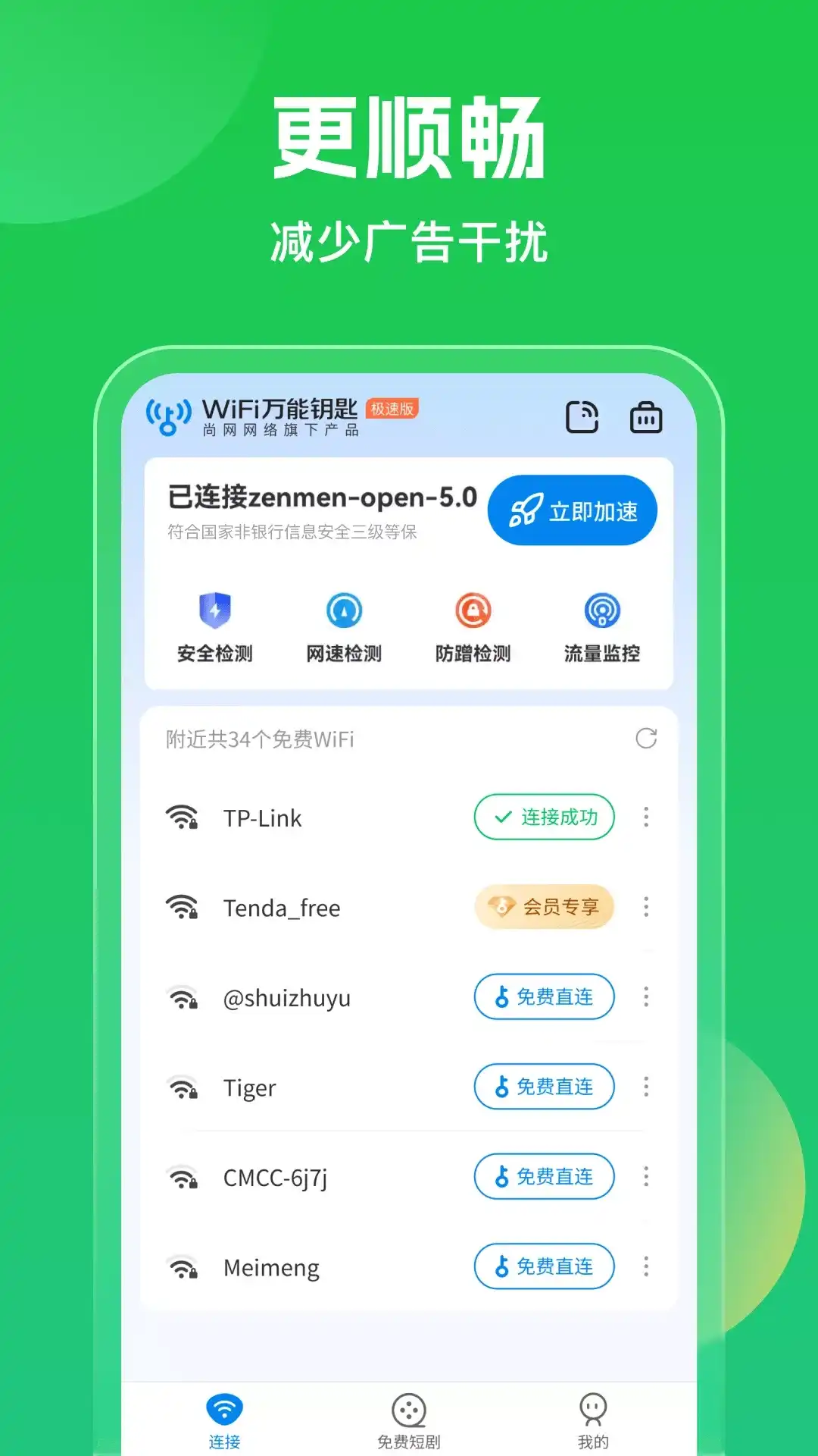 WiFi万能钥匙极速版 - 更小包体,极速上网。无论身处何地,免费安全WiFi热点,无忧一键连接。 【免费使用】上亿热点库,你的手机上网神器,安全极速WiFi上网管家,节省流量,随时随地免费连接优质WiFi。 【极速顺滑】一键查询,秒速发现免费WiFi热点,极速顺滑流畅连接,刷抖音逛淘宝打王者再无卡顿! 【精彩内容】海量短视频,一键连接,精彩不停歇,尽在WiFi万能钥匙极速版! 【安全管理】全面保护上网环境,热点安全检测,保护信息安全,网速测试,信号检测,认准WiFi万能钥匙官方正版APP。 客服电话:400-035-8000 邮箱:wifikeyservice@ zenmen.com 官网: www.wifi.com