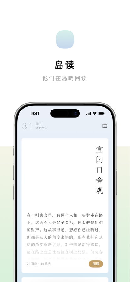 每天 5 分钟,读点好文章。 岛读,一个极简主义的每日阅读应用。在这里,你不止能发现值得一看的好文章,还能遇见和你一样认真有趣的人。从散文到诗歌、从小说到随笔,每天用上几分钟,与更有趣的灵魂对话,为你的心灵注入光芒。 ———— 一日一文:每日精选经典好文,与思想者见字如面 发现想法:以文字致敬文字,用想法遇见更有趣的灵魂 收藏文章:收藏有价值的好文章,常看常新 夜间模式:深夜护眼模式,睡前 5 分钟阅读时光 阅读打卡:开启每日提醒,不错过每篇好文章 极简设计:极简留白设计,让文字畅快呼吸 聆听朗读:让文字有声音,陪你走过每一段时刻 ———— 岛读:他们在岛屿阅读 欢迎来信:hi@readao.pro 相关协议: ·会员及续费协议:http://readao.pro/terms.html?id=license ·服务协议:http://readao.pro/terms.html?id=service ·隐私政策:http://readao.pro/terms.html?id=privacy