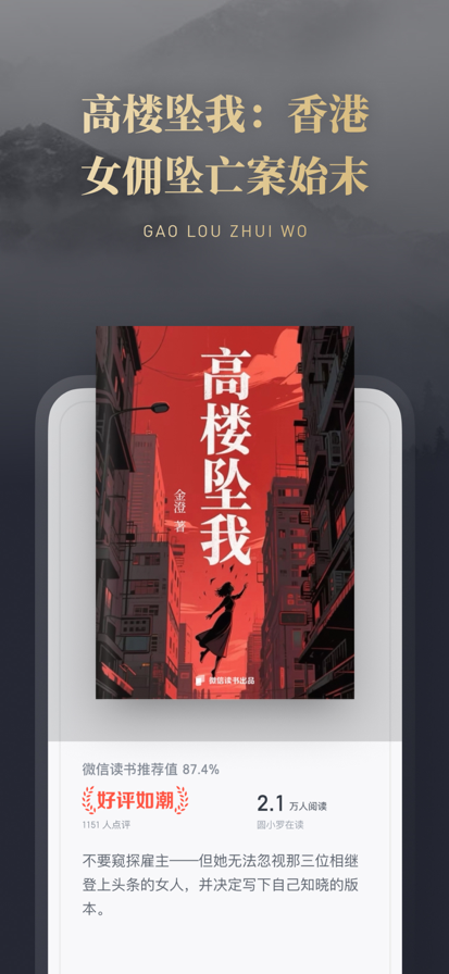 「微信读书」是微信官方阅读应用,提供海量优质书籍和流畅的阅读体验,帮你记录阅读数据和读书笔记,更有丰富的 AI 功能,让阅读更轻松。 【发现优质好书】 提供百万优质正版书籍、品类丰富的书籍榜单和海量主题书单,帮你快速找到优质好书。 【书中讨论交流】 阅读时可浏览其他读者的观点,参与讨论,分享阅读心得,和书友碰撞出更多火花。 【随时随地听书】 海量正版书籍支持全文朗读,更有丰富的书籍讲解和有声书,随时随地解放双眼。 【记录阅读数据】 记录每日阅读数据,支持便捷查阅读书历史和笔记,随时回顾每一步的阅读历程。 【提升阅读效率】 AI 让阅读更轻松,你可以通过「AI 导读」快速了解书籍内容,也能「AI 问书」获得专业的概念解释。 更多信息请访问: 微信读书官方网站:https://weread.qq.com 在微信中搜索并关注“微信读书”公众号,获得更多阅读讯息 微信读书付费会员卡自动续费服务说明 【订阅周期】 连续包月产品,月卡(1个月),季卡(3个月),年卡(12个月) 【订阅价格】 连续包月 19元/月,月卡 30元/月,季卡 60元/季,年卡 228元/年 【付款】 用户确认购买并付款后记入 iTunes 账户 【自动续订】 苹果 iTunes 账户会在到期前24小时内扣费,扣费成功后,顺延一个订阅周期 【取消自动续订】 购买连续包月项目,除非您在当前计费周期结束前至少24小时取消订阅,否则项目会自动续订,您的帐户将在当前计费周期结束前24小时内收取续订费用。关闭 Apple ID 开通的微信读书付费会员卡连续包月服务,可以在 iOS 设备"设置" - "iTunes Store 与 App Store" - 选择"Apple ID" - 点击"查看 Apple ID" - 在账户设置页面点击"订阅" - 取消订阅 【隐私政策】 https://weread.qq.com/policy 【会员服务协议】 https://weread.qq.com/policy?type=membership