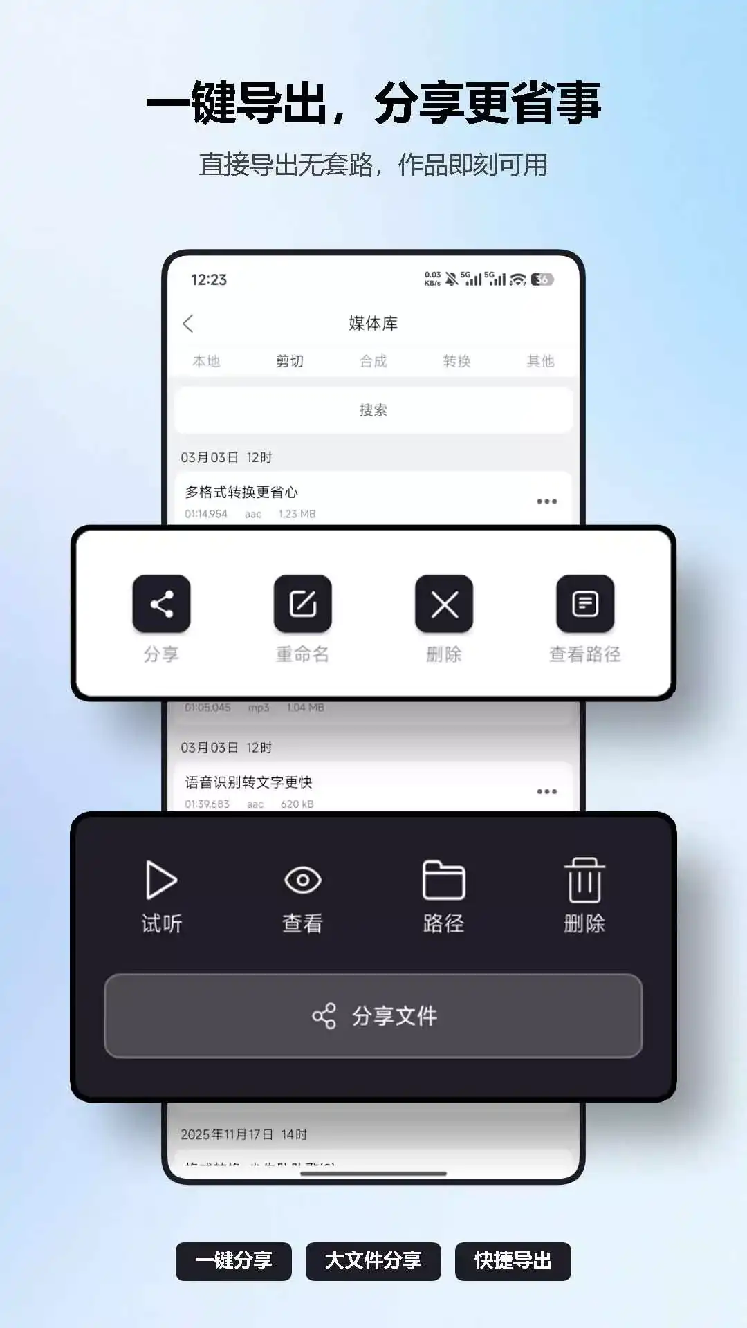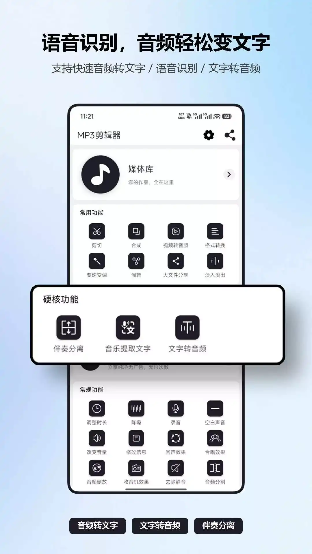 MP3剪辑器,一款把音乐处理高频功能集中到一个 App:从音频剪切、音频拼接、视频转音乐、伴奏提取、语音识别,再到导出分享,流程更顺、效率更高。 【核心功能】 - 音乐剪切 :精准裁切片段,保留重点内容 - 音乐合成 / 拼接 / 合并 :多段顺滑衔接,输出更自然 - 视频转音乐 / 视频转音频 :快速提取可编辑声音素材 - 伴奏提取 :分离伴奏与人声,练歌、翻唱、二创更方便 - 视频转文字 / 文字转音频 / 音频转文字 / 语音识别 :提升内容整理与生产效率 - 音频格式转换 :常见音频格式互转,兼容更多设备与平台 - 调速 / 变调 :按场景调整节奏与音高,练舞配乐和翻唱更贴合 - 混音 :多段音乐自由叠加,串烧与配乐衔接更自然 - 音量调整 / 修改音量 :快速放大或降低音量,前后段落听感更一致 - 降噪 :削弱环境杂音与底噪,让人声和主旋律更清晰 - 调整时长 :按目标时长快速裁齐,适配短视频、舞蹈与铃声场景 - 回声 / 收音机 / 合唱 / 去除静音 / 音频倒放 :一键添加特殊效果,音乐更有氛围和创作感 【常见使用场景】 - 音乐剪辑:做铃声、截副歌、剪高光片段、音乐合并、伴奏制作 - 舞蹈音乐:做音乐配乐、伴舞音乐、音乐串烧、DJ串烧 - 视频创作:提取配乐后继续音频编辑 - 日常使用:音频转格式、素材整理、快速导出 【适用人群】 - 音乐爱好者、舞蹈爱好者、广场舞爱好者 - 幼师、学生、教师 对于音乐的剪切、拼接、混音、格式转换等常用音频处理功能,MP3剪辑器都能提供对应能力。立即下载吧,开启更高效的音乐剪辑与歌曲处理体验。