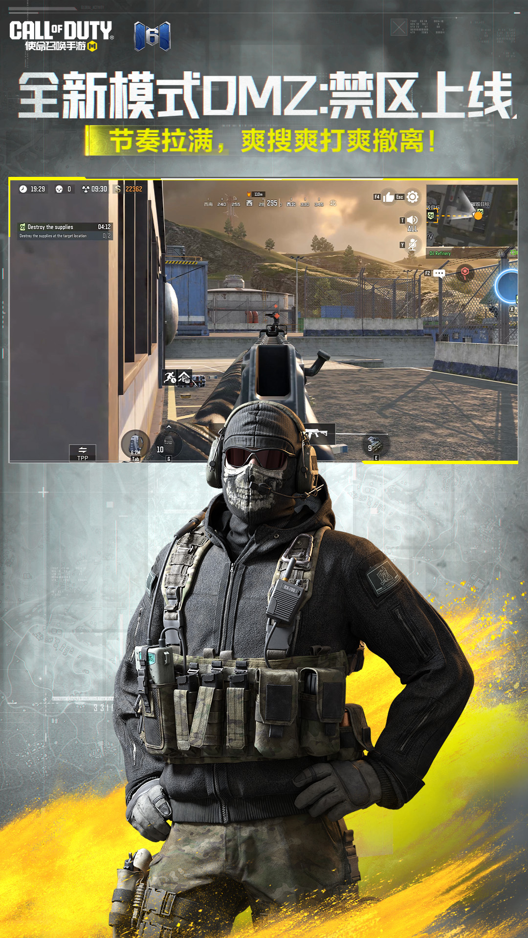 《使命召唤手游》是使命召唤IP正版授权、天美J3工作室倾力打造的3A级枪战手游大作。游戏以高质量的视觉效果呈现游戏品质,高度还原使命召唤系列的经典玩法地图角色;不同的被动技能、终极技能及连续得分奖励的搭配,使得每个玩家都是独一无二的“英雄”存在!海量枪械配件及武器迷彩,枪械diy制定自己喜欢的样式。 全新玩法—DMZ: 禁区:战士们可选择在地图上自由探索、完成合约任务获取奖励、与敌人与其他小队交战,最后在限定时间内成功撤离。 新手感武器—SO-14:拥有不俗的压制火力和不错的稳定性,兼具点放和全自动开火的射手步枪。 新连续得分奖励—混合型步哨遥控坦克:遥控两栖载具,具备自动哨兵功能。 平衡性调整:M1887、QXR、能量剂等枪械、道具迎来调整!战士们快来看看新版本有哪些新变化吧!