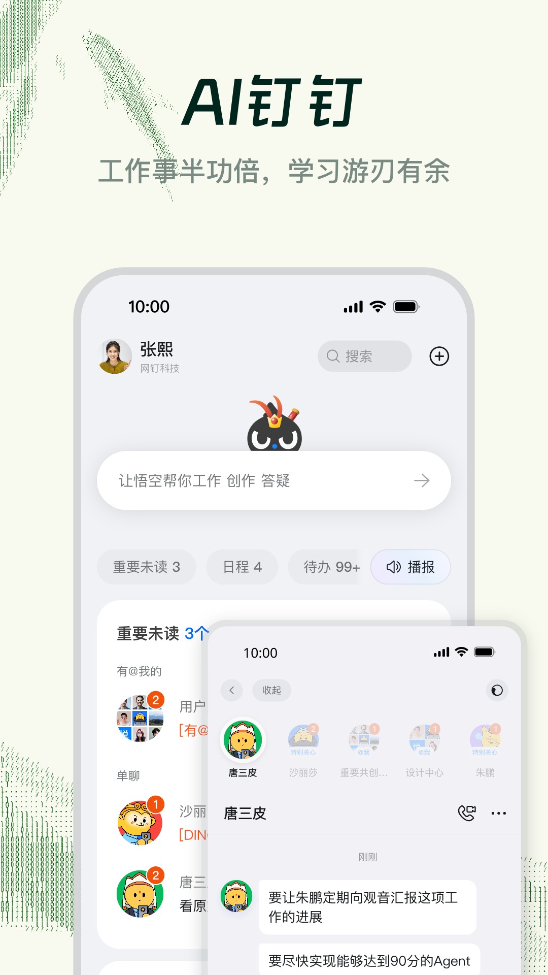 钉钉,AI时代的工作方式。10年来坚持以AI驱动协作,以智能连接价值,服务超千万家企业与组织,让每个企业更快、更强、更具创造力。如今,80%的中国500强企业共同选择钉钉,包括人民日报、中国联通、中国广电、一汽集团、宁德时代、赛力斯汽车、新浪微博、虎扑、中国铁建、太平洋保险、申通快递、长龙航空、柳钢集团、蒙牛、安踏、立白、百丽国际、宇树科技等,覆盖各行各业的标杆客户。<br>你可以这样打开钉钉:<br>1、Al钉钉,简洁、高效、以人为本<br>【智能办公就用 Al钉钉】<br>操作高效,视觉美观:效率岛,智能判断当前最重要的信息,一键触达<br>AI办公小助理(DingTalk A1):自动生成总结纪要、行动待办、分析报告,还能同步AI表格<br>【协同创作就用 文档AI】<br>智联协作:支持在文档中插入表格、脑图、群聊、日程、视频、任务流等丰富元素,让团队无缝协作<br>Al创作:创意构思、方案策划、信息整理,Al帮你唤醒灵感一刻;丰富内容、改写语气、润色文案,创作本就如此轻松<br>【高效开会就用 会议AI】<br>声纹自动识别:自动匹配多人会议中的发言人字幕<br>AI时代的记录方式:闪记升级为“AI听记”,30+行业场景模板助你高效开会<br>2、智能、开放、高效的的协作体验<br>【文档AI】:一切信息皆可联通,多人编辑实时协同,让团队经验有效沉淀<br>【会议AI】:Al实时字幕智能转写,可共享屏幕和文档,通过表情、气氛、状态对他人观点表态,远程开会也和面对面一样<br>【项目AI】:丰富项目模板开箱即用,深度打通文档、群聊、OA审批、Agoal等,实时跟进项目进展<br>【日历AI】:通过自然语言输入轻松创建日程,智能推荐会议时间及场地,团队调度轻松安排<br>【全球化能力】:全界面翻译和系统应用支持超 20种语言,国际化会议自动推荐全员适配时段,企业出海无阻碍<br>3、企业级组织数字化和业务数字化平台<br>【AI表格】:让每个人成为AI应用“创造者”,无需开发,像做表格一样,丰富的500强企业同款模板,轻松搭建业务系统<br>【AI搜问】:企业+全网信息一搜即得,答案、方案、计划一步到位<br>【钉钉管理套件】:提供人事管理、财务管理、差旅管理、客户管理、合同管理、招聘管理等一站式管理数字化方案,助力企业经营升级<br>【钉钉LTC解决方案】:为企业提供目标制定拆解、销售跟进、项目交付、持续服务的端到端一站式平台