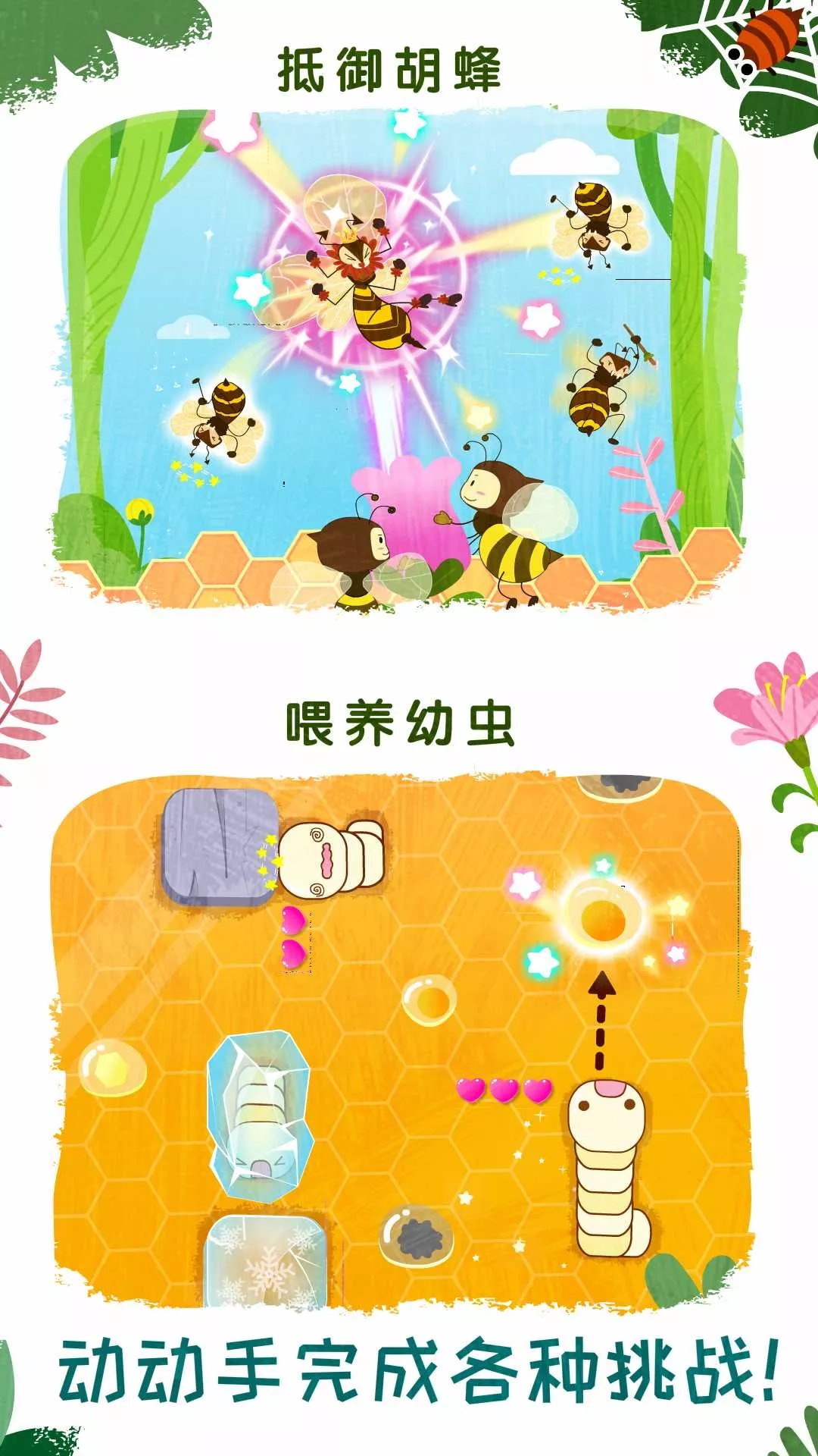 蜜蜂里最勤劳的是工蜂姐姐吗?团结的蚂蚁大军是怎么分工的? 又遇到难题了吧?别愁!【奇妙昆虫世界】告诉你答案! 解密昆虫世界,一招搞定好奇宝宝的十万个“为什么”! 【装扮蜜蜂女王】 舞会快开始了!动手装扮蜜蜂女王吧,涂口红、抹眼影、挑裙子……50多款饰品任你搭配,百变造型,总有一款是你的菜! 【幼虫养成记】 蜜蜂宝宝饿坏了,快带它找些吃的吧!滑动手指控制方向,避开陷阱毒药,吃掉食物,考验你风骚走位的时候到了! 【保卫蜂巢】 警报!警报!胡蜂来抢夺蜂蜜!炮台准备完毕,瞄准,发射……击退胡蜂大军,成为蜜蜂们的大英雄! 【运送粮食】 前方发现食物!蚂蚁大军准备运送回家,遇到大火、抢吃的甲虫该怎么办?开动脑筋,帮助蚂蚁们渡过难关! 【认识蜜蜂和蚂蚁】 有趣的情景模拟,让宝宝在游戏互动中,全方位认识蜜蜂和蚂蚁,学习昆虫百科知识! 产品特色 卡通可爱的昆虫形象,吸引小朋友的喜爱; 简单有趣的互动,让宝宝更快融入情景当中; 让宝宝在趣味游戏中认识昆虫,了解昆虫的生存环境! 你们知道吗?下载宝宝巴士大全,你可以找到孩子们在幼儿园爱玩的角色扮演游戏:认识蚂蚁和蜜蜂,学习自然百科;照顾小宝宝、装扮小公主,体验忙碌的一天;制作甜品和烹饪美食,秒变小厨神;治疗受伤的小动物,做个快乐的小医生;照顾、装扮游戏,感受孕育孩子的辛苦!还有巧虎、小伴龙、糖糖、小猪佩奇、贝瓦等小伙伴陪孩子一起玩拼图,训练逻辑思维。读拼音写汉字,让孩子的识字教育快人一步!认识数字、学习加减法,数学启蒙一步到位!孩子喜爱的爱奇艺动画视频、宝宝树早教儿歌、益智故事和小企鹅乐园,在这里也可以免费获得哦! 宝宝巴士以孩子的兴趣启蒙为出发点,从健康、语言、社会、科学、艺术五大领域关注幼儿成长,吸取蒙氏教育精髓,根据幼儿不同年龄段左右脑发育、敏感期特点和学习重点来设计产品,打造“年龄+能力”的多元化产品体系。让孩子在游戏中独立思考,自由学习,享受探索世界的乐趣。 _________ 设计理念: 宝宝巴士(BabyBus),专注启蒙,而不仅仅是教育。 我们专注于启发,而不只是学习。 我们专注于能力培养,而不只是单一认知。 我们专注于寓教于乐,而不是填鸭式教学。 宝宝巴士,快乐启蒙!全球3.5亿家庭用户的早教首选,您身边的幼儿教育专家! _________ 欢迎联系: 微信:宝宝巴士 微博:@宝宝巴士 官网:http://www.babybus.com 邮箱:cn@babybus.com