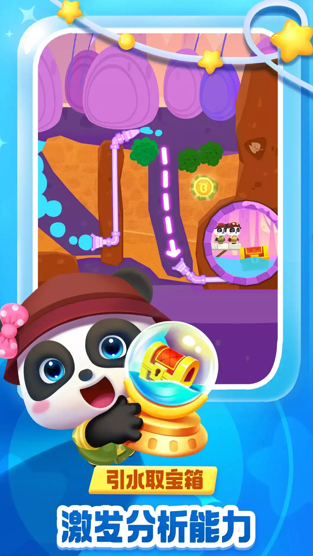 益智APP【奇妙寻宝冒险】将百科认知与关卡剧情相结合。 宝宝利用水的作用和性质,正确规划水流路径,便可通关获得宝箱! 勇敢的宝宝们,快和奇妙寻宝队一起出发,寻找珍贵宝藏,重建梦想小镇! 【5大主题关卡】 充满历史感的古代遗迹、缤纷梦幻的糖果小镇、绿意盎然的植物王国、神秘的洞穴世界,还有科技风格的机械城!准备好了吗?风格迥异的主题关卡,等宝宝来挑战。 【脑力大考验】 规划水流路径,利用水的浮力,让宝箱浮上来!挖掘土块,控制水的方向。前方有障碍物,注意躲避。这一环节的设计,不但考验了宝宝的应变能力,还将测一测宝宝的空间布局能力。 【益智闯关道具】 石块挡住了水的流动路径,这可怎么办呢?小小地雷来帮忙。引水启动,砰!一定范围内的障碍物全部消失。还有手动操作的移动容器、水车机关……宝宝们,都来解锁试试吧。 【知识科普图鉴】 “水是天然的灭火剂,水经过高温加热会变成水蒸气……”宝宝们每通过10关,【奇妙寻宝冒险】便会奖励一张知识图鉴!方便宝宝认知通关所运用到的知识点。