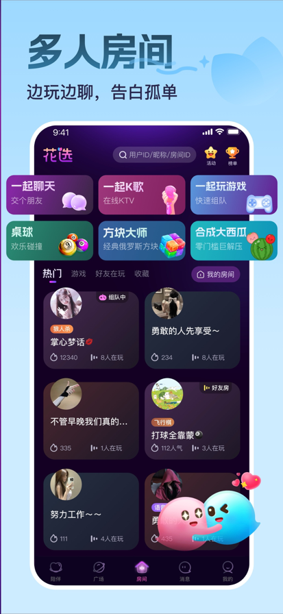 在花选,汇聚了超多有趣灵魂,可以随时随地陪你一起连麦互动、畅玩游戏、在线K歌,一起体验多元化的温暖陪伴! 玩法介绍: 【暖心陪伴】声音治愈,给你温暖的陪伴! 【语音房间】多人连麦,快速结交新朋友! 【休闲游戏】轻松组队,玩乐嗨不停! 【连麦K歌】K歌房间,多人一起嗨唱! 【动态广场】发布瞬间,关注好友动态! 花选App,让每个孤独的灵魂都有人陪伴!