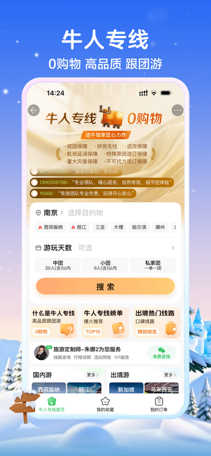 途牛旅游网创建于2006年,以“让旅游更简单”为企业使命,为线上、线下消费者提供包括跟团、自助、自驾、邮轮、景区门票以及公司旅游、机票、酒店等在内的产品和服务。 持续提升及控制旅游产品质量,不断创造和升级高品质的服务供给,途牛先后打造了高品质跟团游“牛人专线”等一系列产品品牌。“牛人专线”作为途牛首个独立产品品牌,诞生于2009年,在在线跟团游市场中,通过高质量地接、行程优化、深度资源采购、特色餐饮等众多举措,大幅提升游客跟团出游体验。截至2021年第一季度,牛人专线已累计服务超540万人次出游,客户满意度达到97%,更有超过五百条超99% 满意度线路产品供游客选择。 伴随着用户出游趋势的个性化、碎片化,途牛建设了全品类动态打包系统。通过动态打包,客人可以自主定制、任意组合出行方式、住宿、玩乐等,让产品供给与需求的连接高效地满足了客户多样化出游需求,同时实现了“打包订,更便宜”的产品优势。 【联系我们】 官方网站:http://www.tuniu.com/ 官方微博:http://weibo.com/tuniulvyou 微信服务号:途牛旅游网(T4007999999) 投诉建议:4007999999(24小时)
