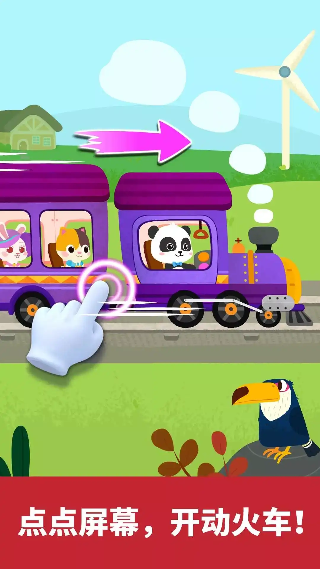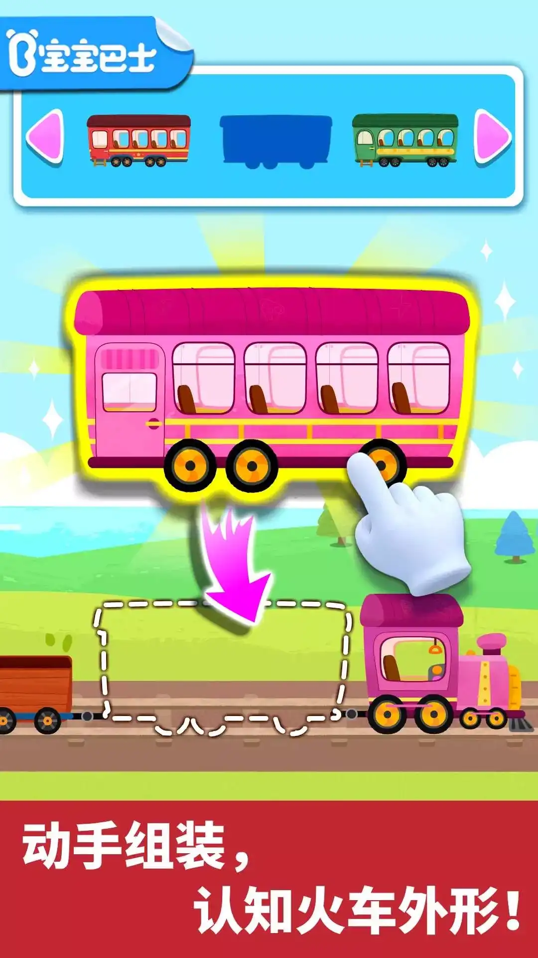 【宝宝小火车】中通过组装和模拟驾驶火车,让宝宝认知火车的构造、作用,学习乘车知识,体验驾驶乐趣! DIY小火车! ——学习火车结构 火车长什么样呢?帅气的车头,再加上长长的车厢、货箱,小火车就组装完成啦!驾驶它开启冒险之旅,Let's Go! 运货、载人! ——了解火车作用 长长的火车,有大大的能力,既能载人还能运货!快启动吊机,把苹果、西瓜装上火车运走吧! 火车乘坐指南! ——掌握乘车知识 乘客们要上车啦!宝宝帮忙检票、找出行李箱中的危险物品,引导乘客排队,安全乘车哦! 攻破路上7大关卡! ——提高解决问题的能力 小火车遇到困难了。宝宝快发挥聪明才智,放下闸栏、清理铁路、修好铁轨,让火车行驶顺畅! 下一站,沙漠! ——4大场景,培养观察能力 神奇小火车,加速前进!穿越田野、城市、隧道,驶向沙漠!沙漠有什么小动物呢?注意观察哦。 宝宝快和奇奇一起驾驶火车,开启新的旅行吧!