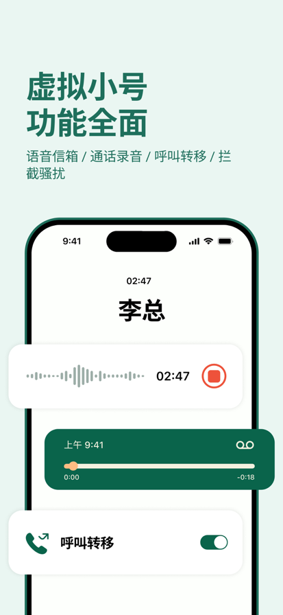 重要通话不想漏?一键录音就够了。 支持拨打电话录音、本地录音 操作简单,直接应用内拨号即可 音频自动转文字,回看更轻松 云端加密保存,随时导出,安心又靠谱 会员订阅说明: 1. 付款:用户确认购买并付款后会通过 iTunes 账户直接支付。 2. 取消续订:如需取消续订,请在当前订阅到期 24 小时以前,手动在 iTunes/Apple ID 设置管理中关闭自动续订功能。 3. 自动续订:苹果 iTunes 账户会在到期前 24 小时内扣款,扣款成功后订阅周期自动顺延响应周期。 4. 隐私政策:https://docs.qq.com/doc/p/a27bfdeac2c861df65c42bf14c0b1baaa8c86318 5. 服务协议:https://docs.qq.com/doc/p/a7b91f083a1699f46f923bf806c4c98a7655b7f8