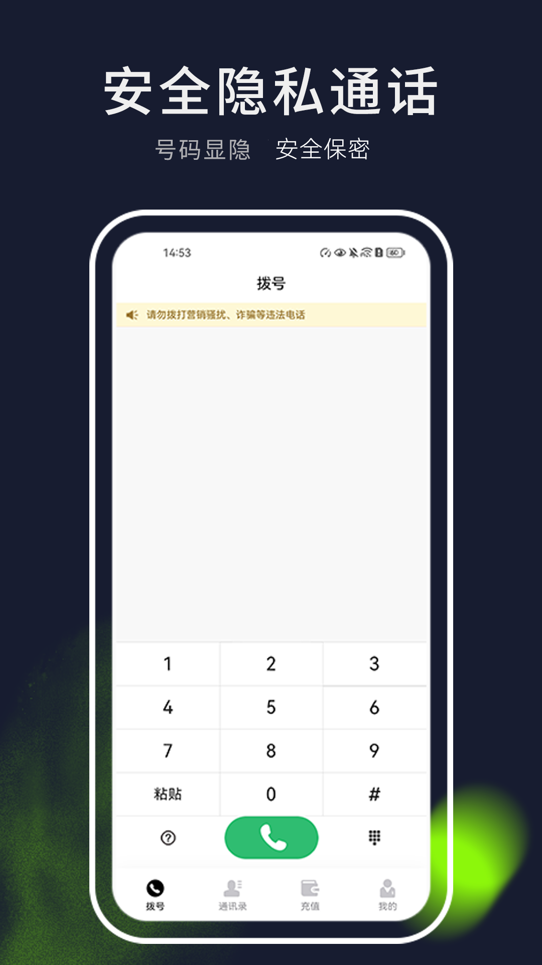 3G网络电话—采用全新语音云处理技术,实现语音高清解码输出及实现超低资费,音质媲美传统电话,节省话费90%,3G电话还能灵活显隐号,匿名专线拨打防窃听与追踪保护您的隐私。 <br>【智能】自动设置显示或者隐藏手机号码,防号码拦截;更换隐私号码打电话,隐藏主号码、主号归属地、运营商,保护个人隐私信息不外泄 ; <br>【免流】无需流量,在3G/4G/5G环境下,无WIFI打电话,快速接通;通话覆盖三大运营商,接通后无网络情况下也可正常通话; <br>【安全】匿名号码显示,防止电话被标记、破译;通过内置加密算法终端对信号全链路加密,机密性好,防止外泄; <br>【高清】一呼百应,一键即通,稳定无断线,绿色无任何限制; <br>【省钱】3分打遍全国,更有包打套餐,能隐藏号码给TA意外惊喜噢; <br>【保障】13年品牌沉淀,2.9亿人的共同选择,良好口碑,值得信赖;