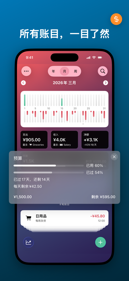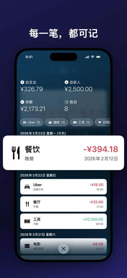 永久免费使用,高级功能可通过订阅专业版获取。 记账是一种生活态度,理应简单明了,而不是负担。 可记是一款简单、美观、智能的记账应用,帮助你快速记录日常收支,掌握消费习惯,清晰了解钱花在哪、花了多少、什么时候花的。每天只需 30 秒,就能轻松管理个人财务。 主要特性 • 极简操作 只需输入一个数字就能完成记账,所有操作都在一个界面完成。内置计算器,轻松计算收据总额。 • 精美的主屏幕小组件 无需打开应用,就能在主屏幕一眼查看预算进度和最近支出。 • 智能报表 用精美图表清晰展示收支情况。设置月预算,接近超支时即时提醒,并提供未来开销趋势预测。 • 快捷指令集成 支持 iOS 快捷指令与 Siri,无需打开应用即可添加收支,轻松实现自动化记账。 • 智能推荐 可记会记住你的常用支出,如地铁、咖啡或账单,只需轻轻一点即可快速记录。 • iCloud 云同步 在 iPhone 与 iPad 间实时同步数据,随时随地掌握账本。 • 隐私保护 所有数据仅存储在你的设备与 iCloud 中。支持密码、Touch ID 或 Face ID 加密。 Pro 专属功能 • 财务预测:根据历史记录预测未来的收支趋势。 • 多币种支持:适合旅游、出差或跨境消费。 • 收据扫描:拍照或从相册选取,AI 自动识别并填充交易信息。 • 重复交易:自动生成周期性账单和收入。 • 背景主题:使用精美动画背景,个性化你的主界面。 可记,让记账变得 轻松、优雅且高效,帮你更好地掌控金钱与生活。 使用条款: https://www.apple.com/legal/internet-services/itunes/dev/stdeula/