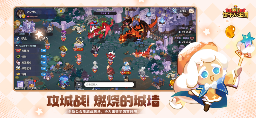 《冲呀!饼干人:王国》是一款结合模拟经营玩法元素的卡牌战斗手游。故事诞生在美味的面包大陆,饼干们逃离了魔女的烤箱,在旅程中相遇成为伙伴,一起携手重建曾经富饶酥脆的饼干王国。 游戏中玩家将创建属于自己的王国,开垦荒地,建造生产,装点属于自己的美妙家园,让这里的饼干居民过上幸福快乐的生活。饼干们也会探索未知的大陆,在冒险中不断成长。各具魅力的饼干们将在战斗中发挥各式各样的作用,精彩绝伦的作战将有赖于玩家的智慧搭配! 游戏中不仅有可爱的饼生百态,还有热火朝天的日常建造,冒险路上奇妙的故事以及玩家间的热血的对决!而在一些隐秘的角落,危险也在逐渐靠近。亲爱的饼干朋友,快进入饼干们的奇妙世界,一起重建王国,可爱冒险吧! 【甜蜜酥脆,欢迎进入甜点宇宙】 饼干这个甜蜜又渺小的存在,突然有一天获得了生命。在这个由甜品构筑的世界里,迷人而有趣的冒险故事、饼干文明、酥脆建筑、美味饼干将陆续登场。接下来让我们一起来见证繁荣的饼干王国,香喷喷的米饼村,神秘的花朵之都吧~ 【佛系养成,和超有个性的饼干相遇】 自由的魔女创造出多彩的饼干,看似随意的配方烘焙出各具特色的存在。饼干人有着不同的故事,性格,虽然饼干的身体容易破碎,但这无法阻挡他们追逐梦想的决心!在这些或勇敢,或胆怯,或开朗,或温柔的饼干中,你将见证一个个鲜活的饼干生命,在王国的街道上,在一段段故事里,感受饼干人精彩纷呈的世界。 【快乐冒险,带着勇敢去战斗】 饼干们逃离最初的烤箱,以勇敢的力量踏上旅程。从百废待兴的饼干王国到巨龙遗迹,在风沙漫天的红糖沙漠里解救被哥布林困扰的旅人,当推开尘封已久的英雄大门进入迷雾笼罩的石榴森林后,这个世界甜蜜而心碎的秘密逐渐拉开帷幕。除了惊险有趣的冒险旅程外,更有悬赏公告、王国竞技场等丰富玩法等待你的挑战! 【王国装修,给饼干人一个温暖的家】 不同的甜品文明造就风格各异的美味家园,从欢乐古早的米饼村,到古色古香的花朵之都;从奇幻的魔法之都到祥和的香草王国,海风图社的糖糖地精将用图纸帮你一一构建,从此王国建造更自由、更轻松、更快乐!除此之外,更有美轮美奂的玉露芥子莲建筑,期待各位饼干朋友的到来! 【更高追求,公会组团强度竞技】 更多饼干更多欢笑!加入公会一起打造温馨的公会家园,挑战庞大凶猛的红丝绒蛋糕龙。贡献公会的烽火,抽取公会扭蛋,还有每周海量水晶福利等丰厚奖励等你来拿!