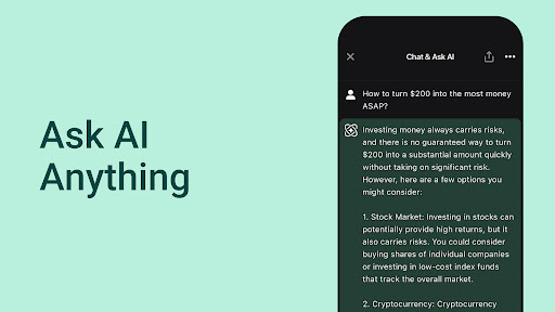 Introducing Chat AI app - an AI powered chatbot and smart AI assistant built on GPT 4 & GPT 4o.<br><br>With Chat AI, you can ask AI any questions and get human-like conversational responses instantly without having to create an account or provide your email address and phone number. Simply download this AI Chat app and you're ready to chat with the most advanced AI chatbot without logging in.<br><br>With Chat AI, developed on GPT API (GPT 4 & GPT 4o models, etc.), you can access the most advanced artificial intelligence technology on the go. Whether you need answers to questions, help with writing professional content and providing creative inspiration, or just some casual chitchat, you have a personal AI assistant in your pocket that never sleeps.<br><br>GPT (generative pre-trained transformer) is a type of large language model (LLM) first introduced by OpenAI that can understand over 100 languages, including English, Spanish, French, German, Italian, Portuguese, Chinese, Japanese, Korean, Arabic, Hindi, Russian, Turkish, Indonesian, and more. With Chat AI, developed on the latest GPT models, an AI language tutor and AI translator is ready to serve for you anytime and anywhere.<br><br>ChatAI is a powerful AI writing assistant. Whether you want this AI app to help you write essays, articles, reports, poems, stories, emails, etc., or transform the writing style to be professional, casual, humorous, friendly, unfriendly, etc., the AI assistant app generates responses patiently without complaining.<br><br>AI chatbot can help students with homework or assignments by answering questions, explaining concepts, providing definitions, summarizing key information, offering perspectives and examples, generating writing, creating personalized study plans and improving learning skills. This artificial intelligence learning app can help with homework in a variety of subjects, including math, science, history, literary, coding, biology, language, etc. Students who cannot pay can still benefit from daily access to the free chat AI app.<br><br>The chatbot AI model is trained to interact in a conversational way. The chatbot can remember the chat history and chat with you like a human. It's helpful for a chatbot AI app to answer follow-up questions, admit its mistakes, and generate new ideas based on past conversations.<br><br>This artificial intelligence app also allows you to create multiple AI chat bots and AI characters with different settings and personalities. Simply add the custom instructions or prompts, and you'll be able to talk to the character AI bots you just created, whether they are bots for special tasks, roleplaying, virtual friends, AI companions or your favorite actors.<br><br>With AI-powered smart assistant, you can even replace the default assistant for Android with a custom chatbot or character AI built on GPT API. Whether your phone is locked or you're using other apps, you can instantly chat with AI by long-pressing the power button.<br><br>The AI chatbot can hear and speak now. Chat AI, developed on GPT 4 & GPT 4o, allows you to chat with AI using your voice. Whether you're walking or driving, you can talk & ask AI anything, anytime and anywhere.<br><br>Download the Chat AI app now!