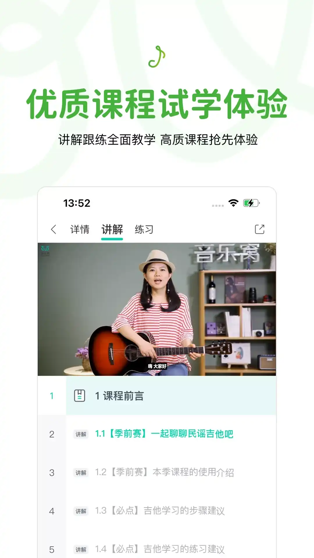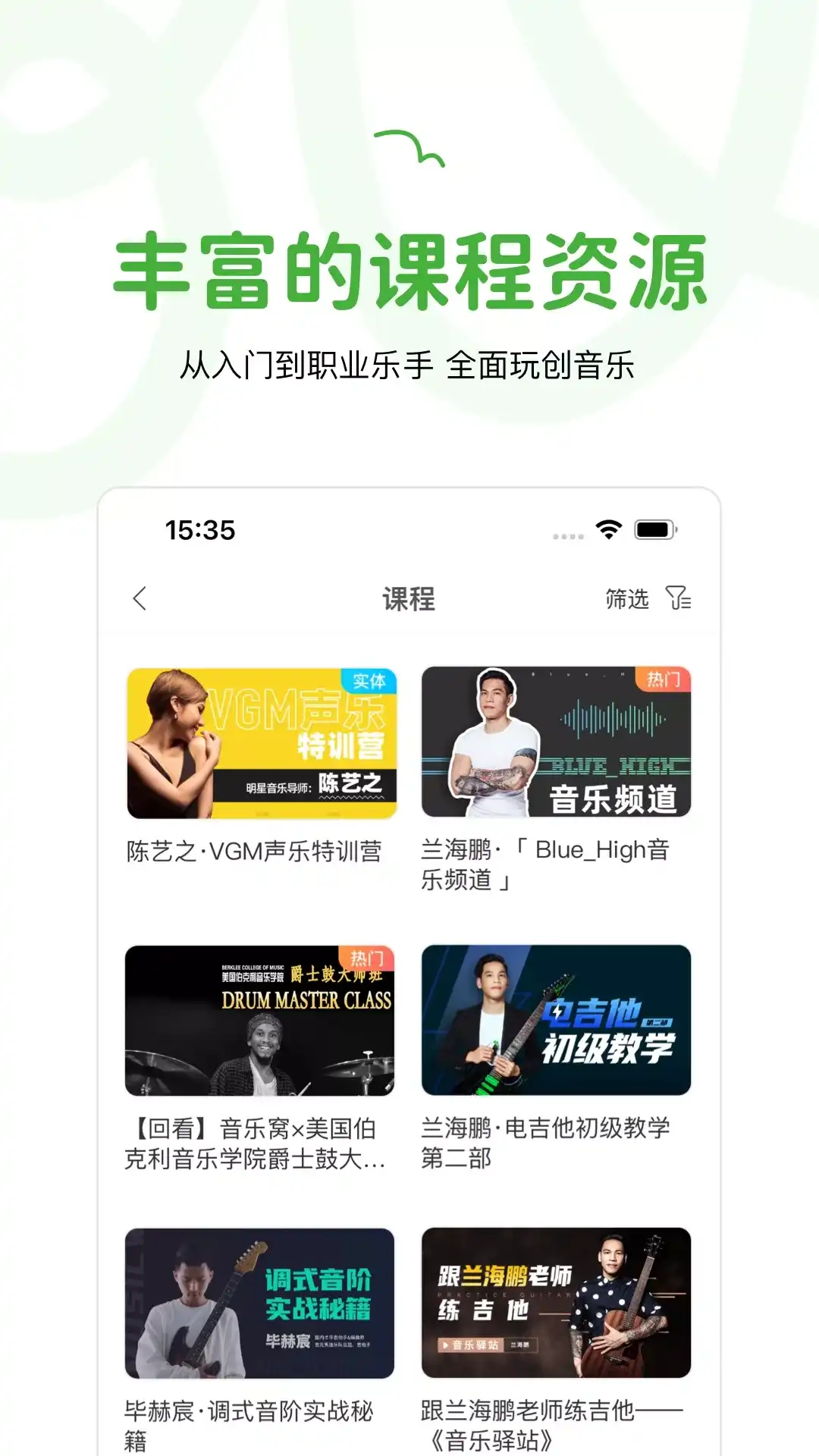 【AI智能互动教学】 AI音乐学园-真实还原线下吉他(木吉他、电吉他)、钢琴、尤克里里、声乐等多种乐器的一对一教学体验,采用先进的乐音识别及 AI 互动视频教学技术,可以智能评测您的演奏,实时调整您的学习内容,实现个性化的吉他、钢琴、尤克里里等乐器教学。让零基础小白都能轻松学会吉他、钢琴、尤克里里等多种乐器演奏和弹唱,让您的音乐成长之路更加简单、高效! 【歌曲定制课程 】 喜欢什么吉他、钢琴、尤克里里演奏歌曲,您都可以定制对应的歌曲课程,而且可以根据自身的能力水平定制不同难度的版本,而且自动适配男生版或女生版,让您轻松学会弹唱自己喜欢的歌曲,一个小时学会弹唱一首歌曲成为现实。 【体系化的教学课程】 课程体系分成必修、选修和Pro课,覆盖初级、进阶到大神各个级别的能力需求,吉他从弹唱到指弹独奏,钢琴从简谱、五线谱多种学习路径。风格课程从摇滚、布鲁斯到 Funk 等应有尽有,专项课程包括钢琴考级课、钢琴即兴伴奏,吉他爬格子、换琴弦、拨片、钢琴乐理等极其丰富。只需跟着课程体系学习,就能从小白顺利晋升到大神。 【国内知名老师授课】 汇集了业内知名的吉他、钢琴、尤克里里等各个专业老师,结合技术研发了适合在线学习的课程,保证了课程和教学的质量。同时让您手机在手,随时随地享受大咖的私教辅导。 【千万学员的共同选择】 自2017年上线以来,为超过2000万学员提供了教学服务,不论是吉他、钢琴、尤克里里、电吉他、拇指琴、口琴还是古筝、非洲鼓等,AI音乐学园356天无休陪伴在您的左右,助力您轻松学会一门才艺,遇见更好的自己! 更有多种学习辅助工具:调音器、节拍器、和弦库,五线谱认音练习,和弦练习、节奏练习等多种工具应有尽有。 从小白到大神,您只差下载一个AI音乐学园!