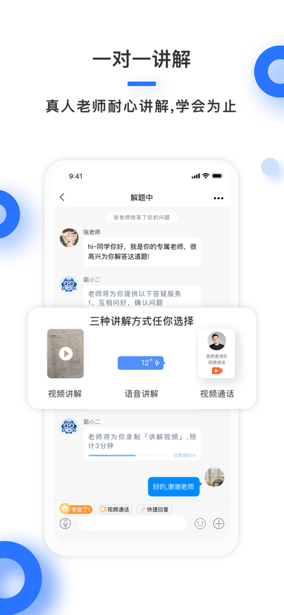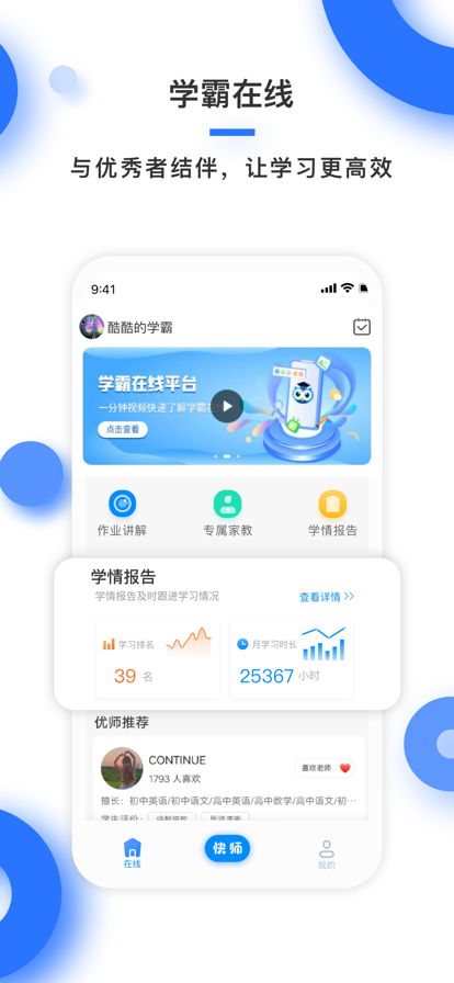学霸在线,在线家教,1对1作业辅导讲解平台—全国中小学生家长的家教平台,在线1对1就用学霸在线! -即问即答:拍下作业,试卷等疑难杂题,极速匹配老师,写作业不再苦恼,问老师不再排队 -跟随你的步调 :无论是课前预习,课后复习还是试卷模拟,随时都有各科老师陪伴左右 -用你喜欢的方式 :无论是图片、语音、文字还是短视频,挑选出你喜欢的方式和老师互动学习,跟随老师的步伐一步一步掌握解题步骤和技巧。 【神马时候用学霸在线】 有作业难题搜不到的时候,快用学霸在线! 课后作业难题无人帮,快用学霸在线! 学习成绩停滞不前,快用学霸在线! 课间课后害怕问老师,快用学霸在线! 如山一般的作业试卷,快用学霸在线! 父母家长不在身边,快用学霸在线! 家庭作业无人辅导,快用学霸在线! 【学霸在线简介】 学霸在线,自信又高效的学习生活! 随时问,马上答,一步一步讲解的贴身好伙伴 无论多晚,各种难题都有老师在线帮你解决问题 月均低至百元的在线家教平台 【学霸在线功能】 1.随时提问:拍照提问,即时应答。 2.作业讲解:即问即答,老师为你一步一步讲解 3.多种学习方式:图片、文字、短视频随你学,视频讲解更直观 4.问题搜索:提问形成天然错题本,随时搜索学习 学霸 0 距离陪伴 掌握知识,思路很重要 【联系学霸在线】 学霸在线在手,难题没有! 学霸在线官网地址:www.xueba01.com 学霸在线联系方式:18501224358 官方群:598645338