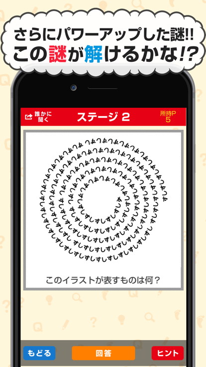 痛快!!謎解きQ~意味が分かるとスッキリ爽快ゲーム~ 謎めいた文字やイラストを見て、答えを探し当てるクイズ方式のイラストなぞなぞゲームです。 数々の謎めいた暗号…。言葉やイラストのパズル…。 あなたは全ての答えを導き出せますか? 収録問題数は100問!! 問題は全て難易度で分けられているので、簡単な問題から挑戦できます。 簡単操作!答えが分かったら回答ボタンを押して、答えを入力するだけ! 答えが分からない時にはヒントボタンを押してヒントを見てみよう。 ヒントを見るにはヒントポイントが1P必要です。 ヒントポイントを使いたくない場合は、SNSなどで友達に聞いてみよう! <ヒントポイントをGETする方法> ・新しいステージに挑戦する(+1P) ・1日1回アプリを起動する(+3P) ・短い動画広告を最期まで視聴する(+1P) 目指せ全問正解!想像力を活かして、いざ脳トレ!! 今、あなたのIQが試される!? 【効果音・音楽素材】 魔王魂 甘茶の音楽工房 ※敬称略