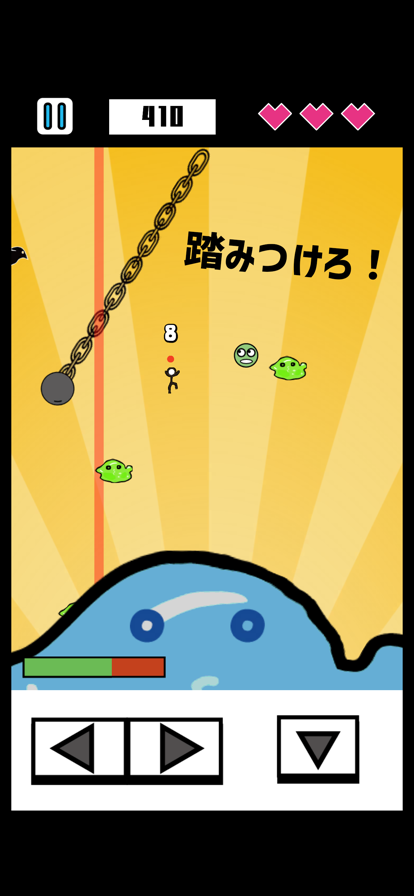 棒人間アクションゲーム第二弾! ユーザー大絶賛のアクションミニゲームが登場!! ●ルール 敵を踏みつけてコンボを稼ぎ,ドロップして攻撃! ボスを倒すとゲームクリア! 赤い敵に触れるとダメージを受けてしまうので注意! ●ランキングモード ライフが0になるまでスコアを競うランキングモード! 目指せ世界一! ●ガチャ 今作ではガチャを実装! 多様なキャラクターのスキンや背景をゲットしよう! ●操作方法 ←→左右移動 ↓ ドロップ、壁ジャンプ ●ゲームのコツ ・ドロップ中はコンボ数が2倍!積極的にドロップしよう! ・ダメージを受けるとコンボ数が半減!タイミングは慎重に見極めよう!