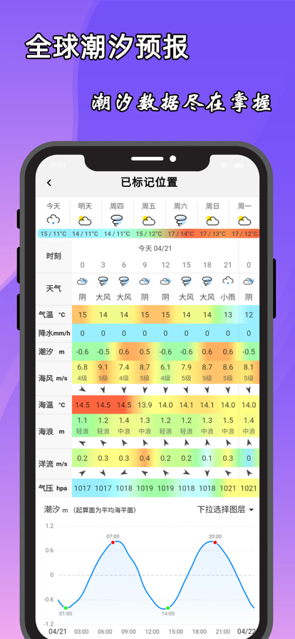 海洋预报APP集成台风、海风、海浪、海温、海流、气温、气压、降水等多种海洋预报要素,可为涉海用户提供全球范围内长时序、多分辨率的海洋水文气象数据查询、分析和制图服务。