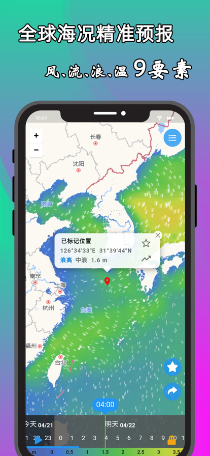 将海洋预报与地理信息技术融合,为公众用户提供基于位置服务的海洋动力环境预报和警报服务,服务范围覆盖中国及邻近周边海域。为用户提供中国沿岸及近海区域内海上任意位置24小时海洋环境预报、未来5天逐小时动力要素精细化预报、一周海况预报以及中国海域海洋环境预报,支持海洋预报信息在不同社交平台的分享与传播等。