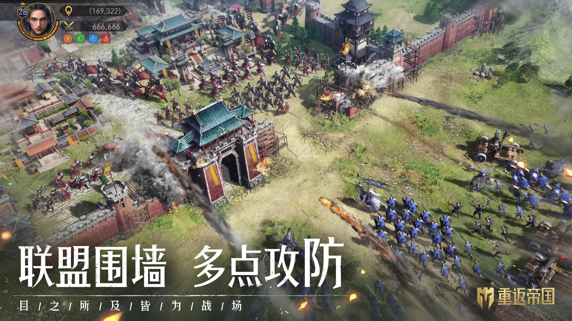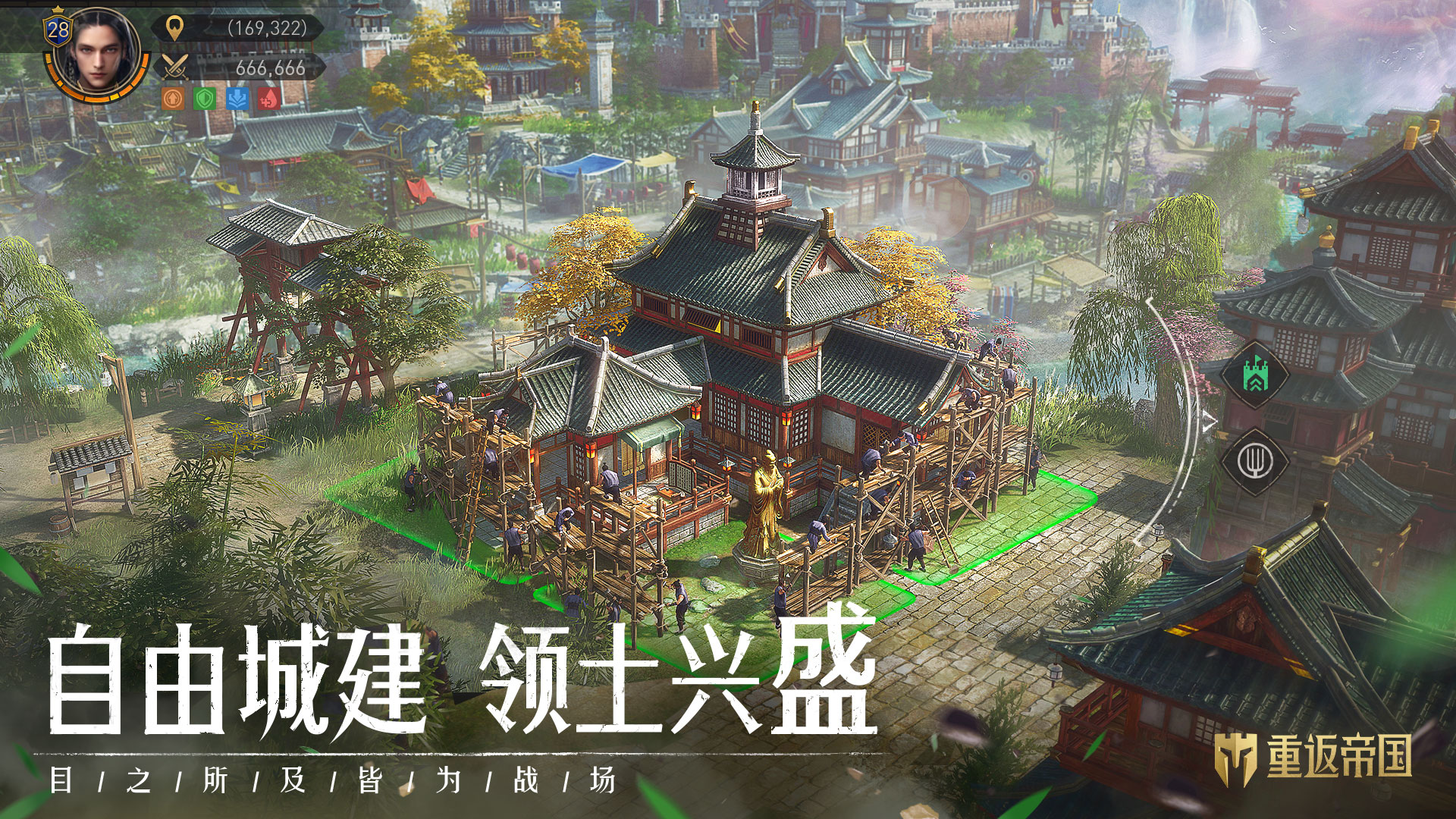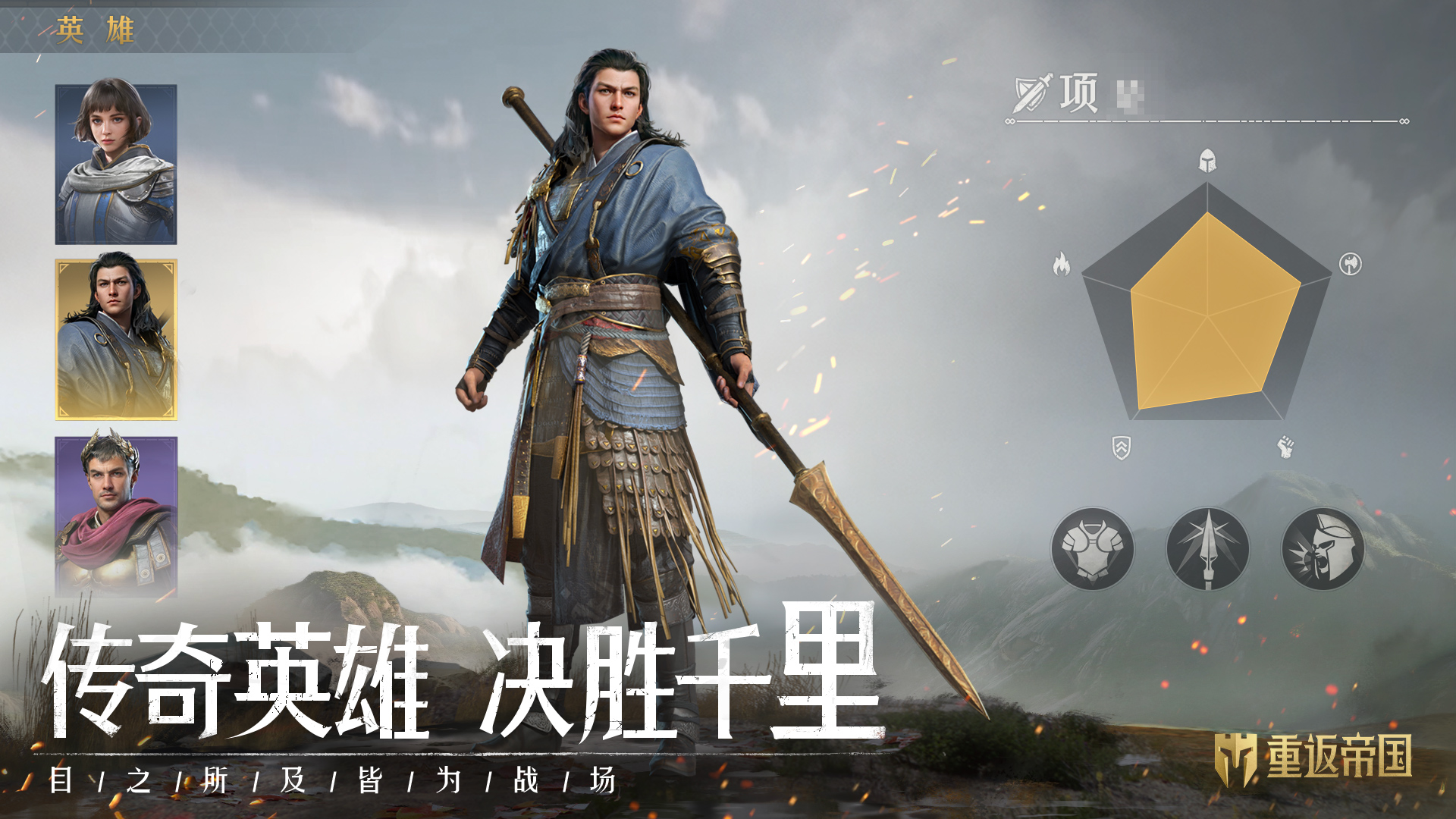 >>《帝国时代》正版合作 >> 自由行军不走格子 攻城掠地策略多变 >> 超世代画质 金色武将下载免费领取 《重返帝国》是由腾讯天美工作室与正版《帝国时代》合作出品的全自由即时策略手游。 游戏吸收了帝国经典元素,你将置身于瞬息万变的活战场,从零兴建城邦,统率世界英雄,不断扩张领土。 在625万平方公里的3D战争大世界,所有策略较量都是即时发生。随着领地不断发展壮大,你将集结同盟征战名城,是操控巨大攻城器械爆破城门,还是指挥盟友在巷战四面合围,甚至化身卧底直至决战反戈一击!联合还是对峙?臣服还是征服?在这里通向王冠的道路从来不止一条! ——“恭迎领主大人,重返帝国!”