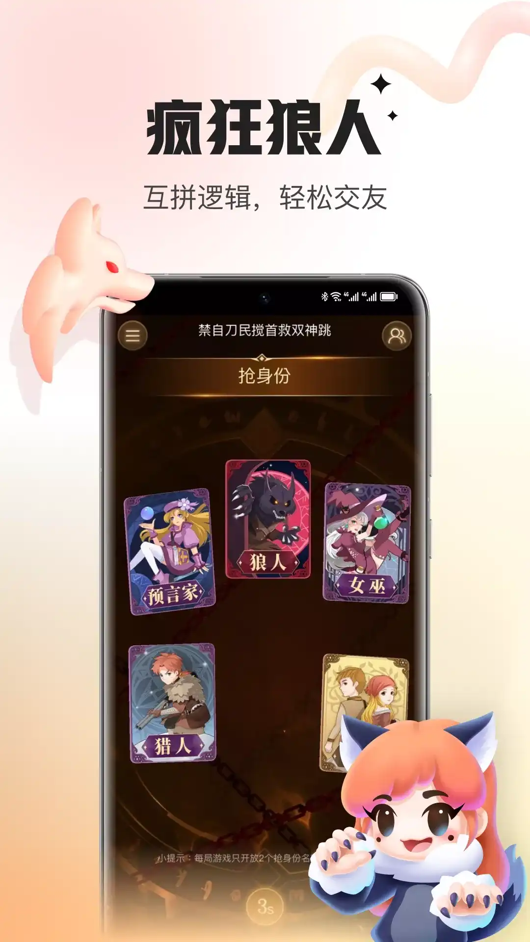 谁是卧底-天黑请闭眼杀人游戏 《谁是卧底》又名《天黑请闭眼》、《杀人游戏》;是一款呆萌炫酷、逻辑极强、模式众多的多人在线文字杀人游戏。 【游戏特色】 ---多人参与拼智力! 真正的多人在线大型杀人游戏,真正的公平快速的文字游戏!不用再害怕人员不齐和场外因素!带上你的判断、你的推理,来谁是卧底比拼智力吧! ---超多职业任你选! 游戏中三大阵营,十余种职业,多种模式随心选择!每种职业都有不同的玩法与技能,游戏独创新模式“怒火街头”,带你领略爆炸的快感! ---在线好礼送不停! 只要每天累计在线时间,就能获得大量金豆及银币!更有机会获得商城的精美时装及特效炫酷的道具!不花钱也能玩的很开心耶! ---超萌宠物求领养! 超赞的宠物系统,快来谁是卧底玩宠物养成游戏吧!会卖萌的吸血鬼公主、神奇的草泥马、呆萌的小狮子!还有百种宠物等你来领养喔!“主人~快来带走我吧!” ---Q版人物萌翻你! 游戏独特的Q版人物,让您在比拼智力的同时领略不一样的萌系画风!呆萌的形象让您在游戏中不再枯燥无聊,找回童心!