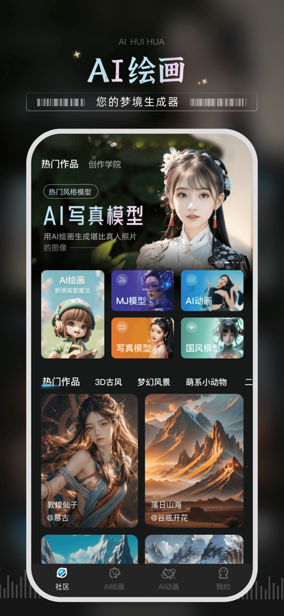 AI绘画宝——以字为画,创意无界 AI绘画,让艺术触手可及。无论你是艺术爱好者还是初学者,AI绘画宝都能满足你的创作欲望。以字为画,以图为图,AI修图,多样风格,每日素材……这里,有你想要的一切。快来AI绘画宝,释放你的创意,绘出属于你的精彩世界! 探索文字与艺术的交融 当文字遇见艺术,会迸发出怎样的火花?AI绘画宝正是这样一个将二者完美融合的创意平台。只需一句话,你的奇思妙想便能化作笔下的灵动之作。无论是梦幻的“浪漫公主”,还是神秘的“白雪王子”,甚至是那遥远天际的“海上日出”,只需简单输入,AI便会将这些想法幻化成色彩斑斓的画作。 图片复刻,传承经典 除了文字创作,AI绘画宝还具备图片复刻功能。你是否曾为某幅画作倾倒,希望拥有与之相似的作品?现在,只需上传你的图片,选择相似度,AI便会为你复刻那份独特的美,让你拥有属于自己的艺术珍品。 动漫卡通,个性展现 想要一个与众不同的二次元头像吗?AI绘画宝的动漫拍照功能,让你轻松实现。无论是甜美、炫酷还是搞怪,多种风格任你挑选,一键生成你的专属二次元形象,展现你的独特魅力。 AI修图,模糊变高清 模糊的照片总是让人遗憾,但AI绘画宝的AI修图功能,能让这些遗憾烟消云散。一键高清化,模糊的图片瞬间变得清晰锐利,让你的回忆重现光彩。 多样风格,选择无限 AI绘画宝提供了海量的艺术风格供你选择。从古典到现代,从写实到抽象,每一种风格都有其独特的魅力。选择你喜欢的风格,让AI为你创作出独特的艺术大片。 每日素材,灵感不断 每日更新的唯美素材作品,不仅为你提供创作的灵感,还分享各种画图描述技巧。让你在欣赏美的同时,也能学到如何更好地利用AI绘画宝创作出令人惊艳的作品。 ------ 关于自动续费 ------ -会员权益:享受无限制AI创作特权; -订阅周期:1周,1个月,1年 -订阅价格:以IAP申请信息为准, -付款:用户确认购买并付款后记入 App Store 账户。 -取消续订:如需取消续订,请在当前订阅周期到期前24小时以前,手动在iTunes/Apple ID设置管理中关闭自动续订功能。 -续订:苹果iTunes账户会在到期前24小时内扣费,扣费成功后订阅周期顺延一个订阅周期。 -首次免费试用:免费试用周期内再次续订或取消续订,不会向用户收回免费试用权益,用户可以继续试用直到试用周期结束; -用户协议:https://aihuihuabao.juzan.info/index.php/useragreement?channel=AiPaintingiOS -隐私协议:https://aihuihuabao.juzan.info/index.php/privacystatement?channel=AiPaintingiOS -会员服务使用条款:https://aihuihuabao.juzan.info/index.php/subscribeagreement?channel=AiPaintingiOS