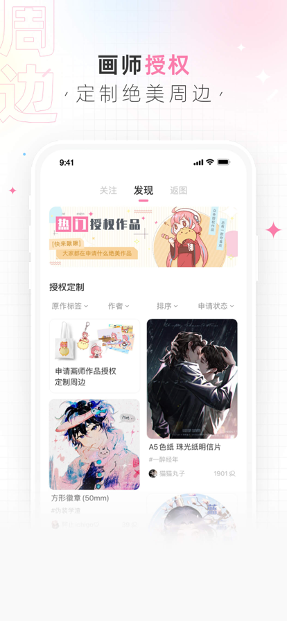 画包包是一个专注于ACGN衍生绘画和周边创作的二次元文创社区。 社区汇集了海量优质的同人绘画作品,第五人格、王者荣耀、魔道祖师、剑网三等同好圈子,条漫、表情包、字体设计、周边设计等内容栏目,轻松找到你喜欢的绘画作品O(∩_∩)O 包包有这些特色功能哟: 1、版权保护 :所有在画包包上发布的作品均可独立设置版权条件:是否允许转载、商用、下载等; 2、内容互动:在画包包上发布的作品,会收到更多的同好关注、评论和点赞,支持创作者精选评论; 3、线上摊位:画包包上可开通线上摊位功能,支持在线发放无料,周边通贩; 4、周边制作:画包包拥有优质的周边制作工厂资源,可以满足各种周边制作; 5、寄送服务:画包包拥有专业的周边产品打包寄送经验及物流仓储,可安心的将无料周边送给同好; 6、收谷屯粮:所有画包包的用户都可以通过在平台上的一些有效行为收获谷子,谷子可用于制作周边、兑换无料、投喂发电等等; 7、圈地自萌:画包包可根据每一个IP开设属于自己同好的圈子,圈子可发布相关话题进行同好交流; 8、领取无料:画包包上拥有非常多对无料周边感兴趣的爱好者们,每周都有领不完的无料周边哦; 9、认证特权:在画包包上完成认证的创作者们,可享有免费制作无料的机会,以及更多的流量曝光和官方合作机会哦! 包包正在努力的成长中哦,希望可以服务更多的二次元创作者和爱好者,成为大家心中最好玩的二次元文创社区O(∩_∩)O~~