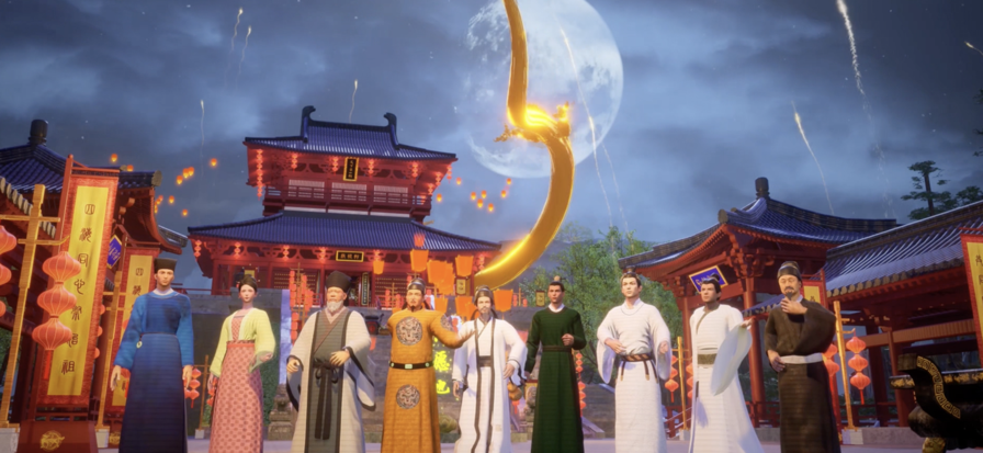 1. 数字拟真复刻还原实景特色。选取仙都景区最具代表性的鼎湖峰、黄帝祠宇和姓氏树等场景和建筑群进行数字数字建模,还原细节。结合文化特色构建超12个场景元素,用户可自行探索,具有较高的自由度。 2. 虚拟人引导跨时空交流。糅合当地历史文化特色,在场景内设计了多处与虚拟人交互场景。通过高进度的建模和动作匹配、精美的台词设计,实现用户与历史人物跨时空互动的同时,深入了解黄帝文化。主要虚拟人物包括:谢灵运、唐玄宗、杜光庭、李白、白居易、李阳冰、朱熹、烧饼店主、考古学家以及可自定义服饰的男女主角等。 3. 全流程沉浸式体验黄帝祭祀大典仪程。将仙都黄帝祭典9项仪程整合进元宇宙中,用户可以以第一人称或第三人称视角参与全程,通过互动可以进行仙花、敬香、敬酒、鞠躬参拜等仪程体验。同时伴有声音和文字介绍,具有极强教育意义。 4. 中国古风场景凸显仙都“仙”气。整体界面风格一中式仙侠风格为主,突破空间限制将景区主要建筑放置同一虚拟空间,特定场景触发金龙飞升、树木生长、孔明灯升天等特效。UI风格借鉴仙都当地“仙”字logo和鼎湖峰背景,以青绿色为主,突出仙都青山绿水风景秀丽。 5. 两种模式提升自由度和趣味性。当用户首次进入黄帝元宇宙时,可以参与黄帝祭祀大典全流程体验,在探索过程中到固定打卡点将得到线索放进背包。集齐7条线索后会触发自由模式,可随机在场景间切换。用户后续如再进入应用可自行选择“故事模式”或“自由模式”进行体验,在自由模式中还增加了驾鸾鸟飞行和许愿等功能。