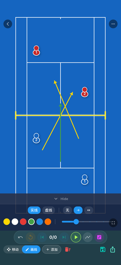 在打出这一分之前,先把它画出来。 网球战术板给教练和球友一块干净的球场画布 — 规划发球落点、回球线路和双打站位。 · 标准网球场,单打线和双打线清晰 · 单打双打阵型一键加载 · 画发球落点、接发角度、上网截击路线 · 动画演示球员移动 · 保存分享 · 离线可用 · 暗色主题 · 50 步撤销重做 · 11 种语言 好的战术不靠说,靠画。