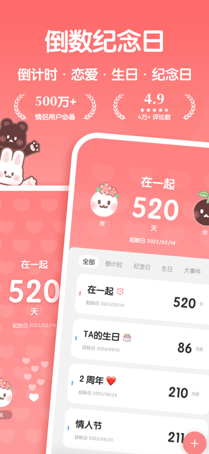 恋爱纪念日(Memories Widget)是一款帮助您记录生活中重要日子的纪念日提醒应用,可倒数或正数计算重要日子的天数。支持记录情侣恋爱天数、结婚周年纪念日、生日、倒计时、假期、高考、重要事项等,让您不再忘记每个值得纪念的日子。 【记录恋爱天数】 ▸ 还记得和另一半相爱多长时间了吗?输入恋爱开始的日期,可以一目了然地查看在一起的天数。 ▸ 快速查看和另一半的纪念日,例如相恋100天、恋爱一周年、520天、1314天和各种纪念日(情人节、七夕)等。 【情侣互动空间】 ▸ 情侣空间:做任务赚金币,和另一半一起精心装饰“小家”。 ▸ 萌宠陪伴:与另一半一起喂养宠物、探险寻宝藏、与萌宠温馨互动... ▸ 心情气泡:发表每日心情,告诉TA你的真实感受。 ▸ 冰箱便利贴:在冰箱贴上暖心留言,共同提醒彼此。 ▸ 纪念日:将自己的纪念日共享给TA,共同纪念日子。 ▸ 照片墙:换上一张甜蜜的情侣照,共同表达爱意。 【日期计算器】 ▸ 正数、倒数计算结婚周年纪念日、生日、恋爱日、高考、假期、重要事项,不再错过值得纪念的日子! ▸ 可倒数某个即将到来的重要日子,或计算过去某个重要日子至今的天数。 ▸ 支持设置农历 / 公历日期。 【重复周期和通知提醒】 ▸ 纪念日重复周期设置:按每天、每周、每月、每年重复。 ▸ 重要日子智能提醒:按当天、提前、累计天数提醒。 【自动排序】 ▸ 按创建时间、天数、日历的方式排序日期,可帮助您专注于即将到来的纪念日。 ▸ 将某个重要日子设定为重要的一天(置于顶部)。 【云端备份和恢复】 ▸ iCloud云端同步,自动备份数据,保护你的重要资料。 ▸ 现在支持多设备(iPhone、iPad)同步恢复数据。 ▸ 你可以通过AirDrop直接将备份共享到附近的iOS设备。 【桌面小组件和锁屏小组件】 ▸ 提供数十款可爱的主题风格,在主屏幕上(iOS14+)可同时创建多个纪念日小组件。 ▸ 您可以自定义编辑小组件,包括修改字体样式、字体颜色、主题颜色和背景照片。 ▸ 您可以选择经典/甜蜜样式的锁屏小组件添加至iPhone锁定屏幕上(iOS16+),让您快速查看必要的信息。 ▸ 横屏充电新玩法,多种精选StandBy待机组件(iOS17+)供你选择。 【心情日记本】 ▸ 结合普拉切克情绪色彩的可爱表情,用治愈且轻松的方式,完成此刻的心情记录。 ▸ 用图片、文字记录恋爱日记,生活点滴。 ▸ 用日历视图随时翻阅以往心情日记。 ▸ 支持深色 / 浅色模式 如果您有更好的建议请联系我们,谢谢! 反馈邮箱:memorywidget@126.com 或在应用中的“设置”→“我要吐槽”提交反馈。 【会员订阅功能】 您可以在应用内使用iTunes自动续订功能获取会员专属功能,我们提供「按月订阅」和「永久会员」套餐。确认购买后,将会从您的 iTunes 帐户中收取费用。您可以在每个周期结束至少 24 小时前取消下个周期的订阅,每个周期结束 24 小时内将会自动续订,已订阅的周期将无法取消。 取消预订:如需取消预订,请在当前扣费期间前至少24小时操作,操作方法:【设置】->点击【Apple ID】->点击【订阅】,选择连续包月情侣VIP取消订阅即可。 ▸ 隐私政策:https://encofire.com/memories/privacy.html ▸ 用户协议:https://encofire.com/memories/terms.html ▸ 官方网站:https://encofire.com/memories ▸ 小红书号:Memories365