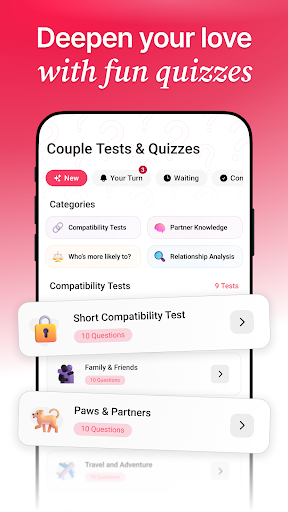 你有没有想过在玩得开心的同时加强你们的关系!<br><br>无论您是新婚夫妇还是异地恋,还是希望加深与配偶或长期伴侣的联系,“情侣”都可以为您的关系增添乐趣。<br><br>“情侣”是交流和加深亲密关系的最简单方式。<br><br>作为日常工作,您可以回答专家准备的日常问题。在你们俩都解决之前,您无法看到伴侣的答案。<br><br><br>比较功能使您能够发现您的伴侣对您的看法。只需选择一个主题并以有趣的方式了解更多关于您的伴侣的信息。不要忘记诚实<br>如果您正在寻找可以在您的关系中发展的领域并了解优势,我们的许多不同主题的情侣测验都在这里为您服务。通过解决每周测验,您将实现改进。 ≈<br><br>最后,情侣游戏是我们应用程序中最具挑战性的功能<br>如果你认为你很了解你的伴侣,那就试试你的知识并猜测你的伴侣的答案。<br><br>有很多不同的游戏主题,你一定会喜欢的<br><br> 特征<br><br>- 使用应用程序中的唯一代码与您的合作伙伴配对<br>- 每天与您的合作伙伴一起回答专家准备的日常问题,以便更加亲近。<br>- 将自己与您的伴侣在不同主题上进行比较,看看您的伴侣对您的看法<br>- 玩几个游戏来测试你对伴侣的了解,看看谁更了解!<br>- 通过完成测验来展示您的优势和劣势,并建立更健康的关系。<br>- 在您的个人资料上跟踪您作为一对夫妇的发展<br>- 答案和猜测保存在应用程序内存中,方便以后使用<br><br>话题<br><br>👉通讯<br>👉金钱与金融<br>👉未来与梦想<br>👉家人和朋友<br>👉性和亲密关系<br>👉乐趣和活动等等……<br><br>请注意,“夫妻”和此处包含的材料、信息并非旨在也不构成医学、心理或心理健康建议或诊断,并且不得用于此类目的。您应始终就您的具体情况咨询合格的医生或心理健康专家。<br><br><br>条款和条件:codeway.co/couples-terms<br><br>隐私政策和 EULA:codeway.co/couples-privacy