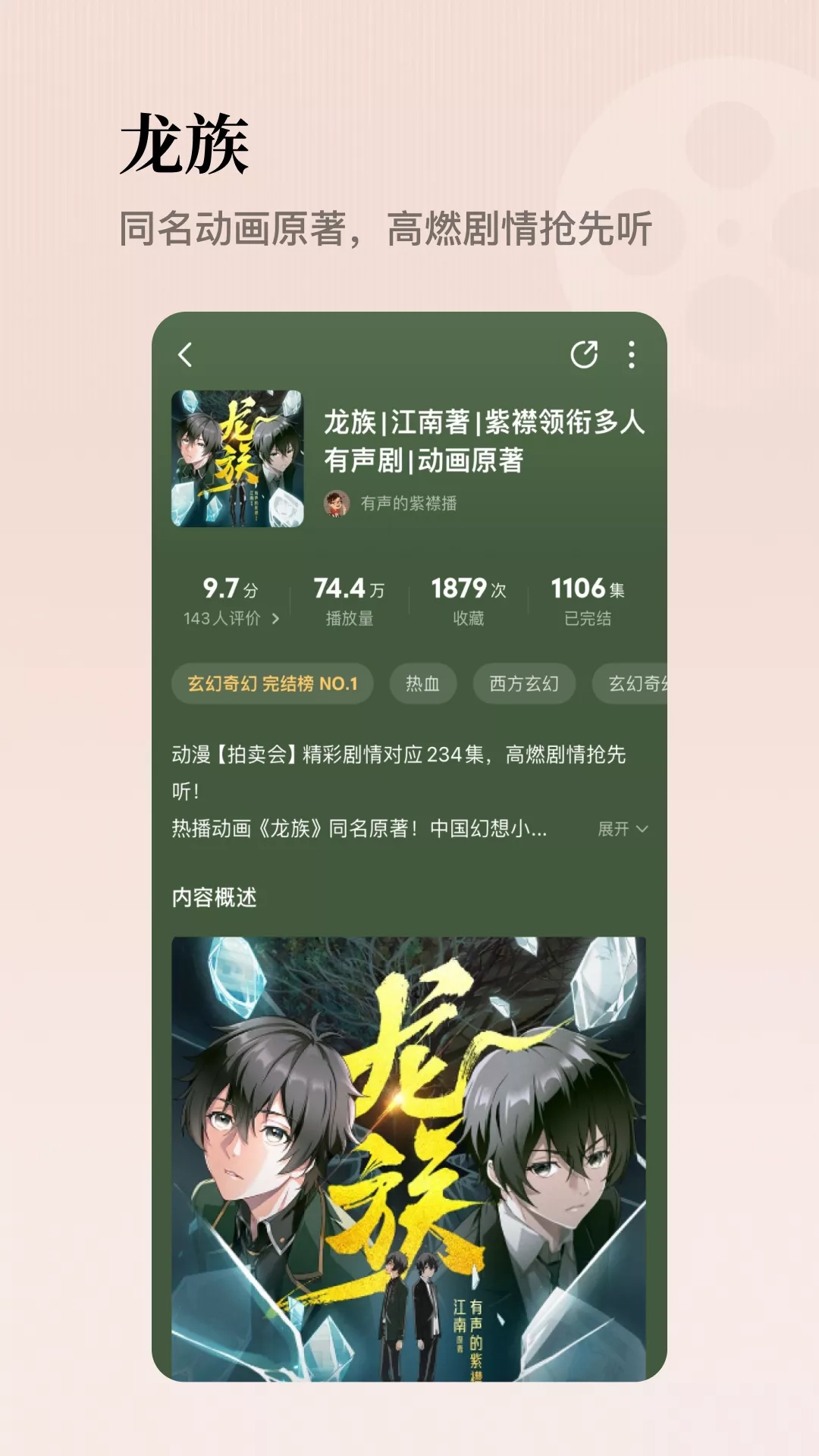 围猎、入青云、与晋长安、锦月如歌、生万物、凡人修仙传、国色芳华、淬火年代长安的荔枝、折腰等经典原著。 万仙来朝、万剑朝宗、燃烧的蜂鸟.时空追凶1990、血孩子、保护我方族长、第一天骄、清朝生活实录、龙魂剑圣、何日请长缨、牧神记、深空彼岸等热门网文出版图书。 【热播影视】 《大生意人》: 陈晓、孙千主演《大生意人》原著,晚清商界博弈破旧立新,借势谋局逆风翻盘,解锁“钞”级玩家的奔"富"传奇! 《凤凰台上》:任嘉伦、彭小苒主演《凤凰台上》原著,双强帝后爱恨纠葛,爱与江山此生不负! 《唐朝诡事录》:杨旭文、杨志刚主演《唐朝诡事录之长安》原著,朝堂诡谲莫测,长安风云再起,破八大诡案,揭身世之谜! 《四喜》:童瑶、蒋欣 主演同名电视剧原著,百态人生笑泪交织、家庭烟火治愈人心!平凡中捕捉幸福,一起寻找成长与自由的答案! 《大乔小乔》:赵露思、陈伟霆主演《许我耀眼》原著,表面光鲜的婚姻下隐藏着谎言与操控?一场关于爱与自我的耀眼重生! 【霸榜好书】 《神墟之主》:穿越仙门,他从记名弟子起步。凭借蚀文天赋与无双智计,一剑斩万劫,重定人道天!看张衍如何以凡人之智,问鼎仙途之巅! 《大道争锋》:携蚀文天赋穿越仙门,从记名弟子起步,看张衍如何以凡人之智,问鼎仙途之巅! 《天堂蒜薹之歌》:如果你想读一部莫言,又怕《丰乳肥臀》《生死疲劳》太过厚重,那么它是绝佳的起点。 故事紧凑,情感炽烈,是莫言创作中“愤怒”与“介入”色彩最为直接和浓烈的作品之一。 《独步成仙》:凡人流巅峰之作!别人修仙靠天赋,他靠嗑丹药肝到三界巅峰! 《全体起立!真龙归来!》:替罪入狱三年,王者归来第一剑,先斩负心人! 《桃花源没事儿》:看马伯庸如何借桃花源写尽当代打工人的仰卧起坐人生。 《草民》:蔡崇达的“故乡三部曲”收官之作,他致力于展现普通人骨子里的韧性和生命尊严。 《便携式桃源》:种瓜得仙草,养鸡变凤凰!骗子乞丐给的破画竟是桃源金钥匙?这波操作直接开启种田修仙暴富路! 【精彩短剧】 《今夜星光点点》《折云作舟》《不问归处》《寒门》《余生无你皆荒年》《归来已是陌路人》《天命凤女》《午夜花店》 【产品功能亮点】 -海量书库-超60万册正版图书,百万小时听书 -精彩短剧-热门爆款短剧任意看。 【福利活动中心】 读书会员、影视热门图书,福利送不停! 【新人福利】新用户海量内容免费看~ 【分类齐全】玄幻、奇幻、科幻、言情、仙侠、都市、出版、历史、悬疑推理、青春校园、女生同人等等~