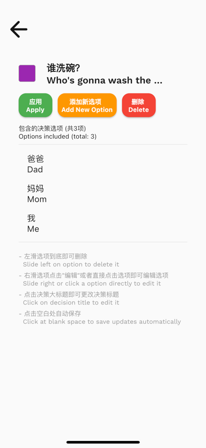 不知道从哪里下手? 别担心!我们的「秘密决策大师」APP将成为您的决策恩人。它以独特的轮盘形式,让您将选择权交给命运的骰子! 只需输入您的选项,然后给轮盘一转,决策结果就出炉啦!无论是确定今晚吃什么,还是为了其它目的地束手无策,这个神奇的决策助手将助您逃离选择困境~