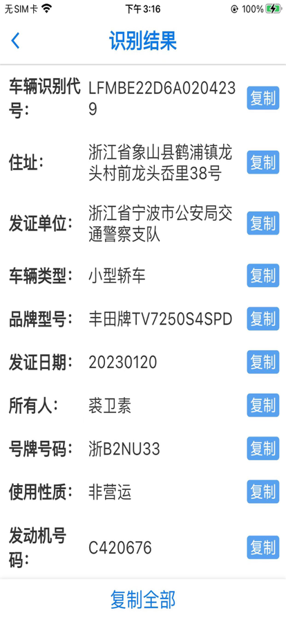 一款针对汽车或者二手车交易,进行发票开写过程中文字输错,车架号输错,地址输错痛点,进行拍照或者相册直接识别行驶证内容,一键复制黏贴,立马开票无误